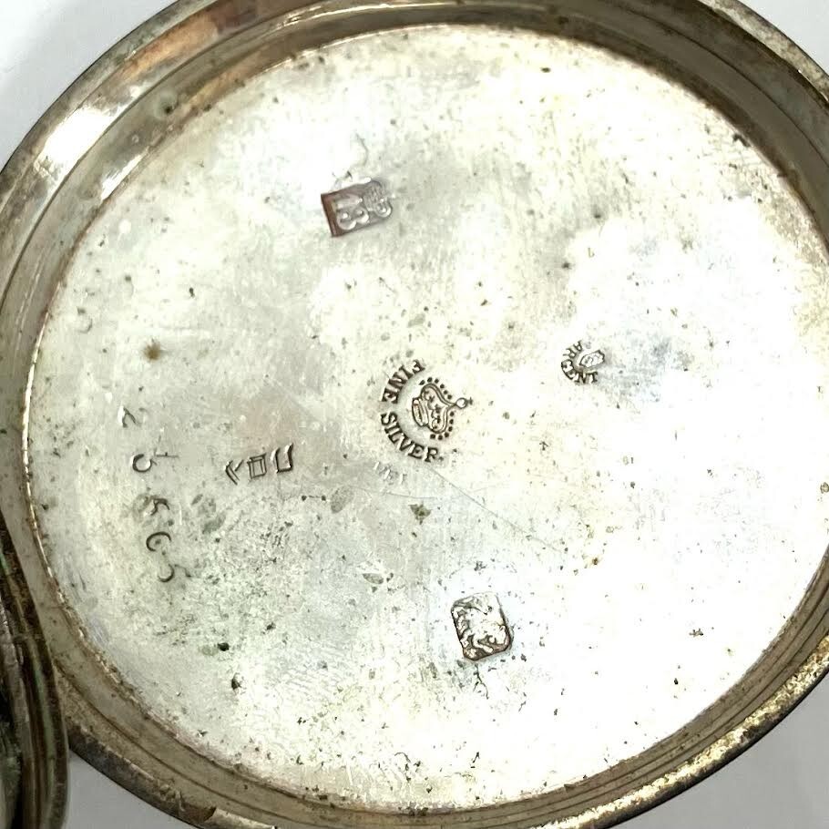 裏蓋の内側に「FINE SILVER」の刻印がございます。傷、汚れ、くすみ、黒ずみがございます