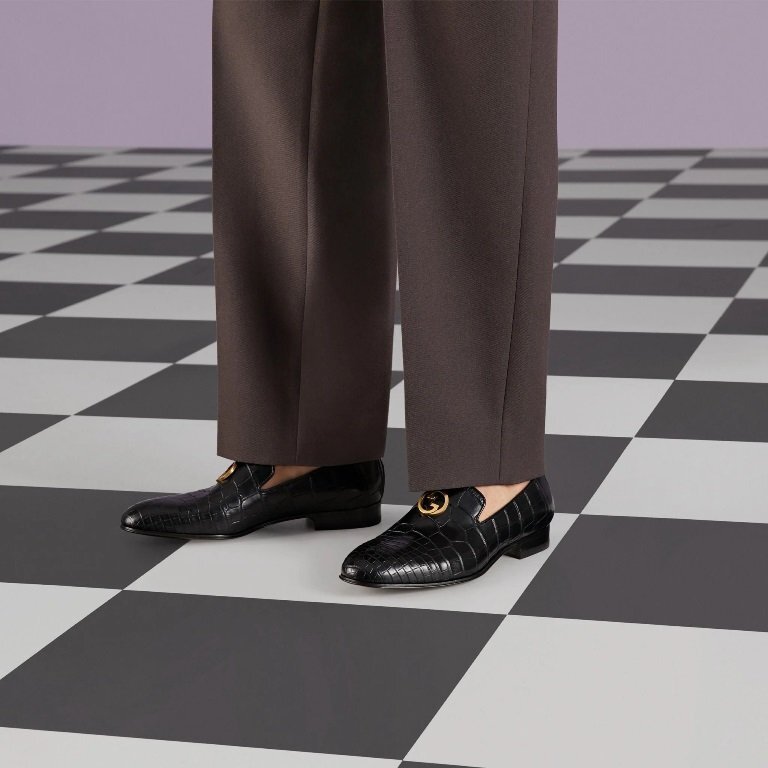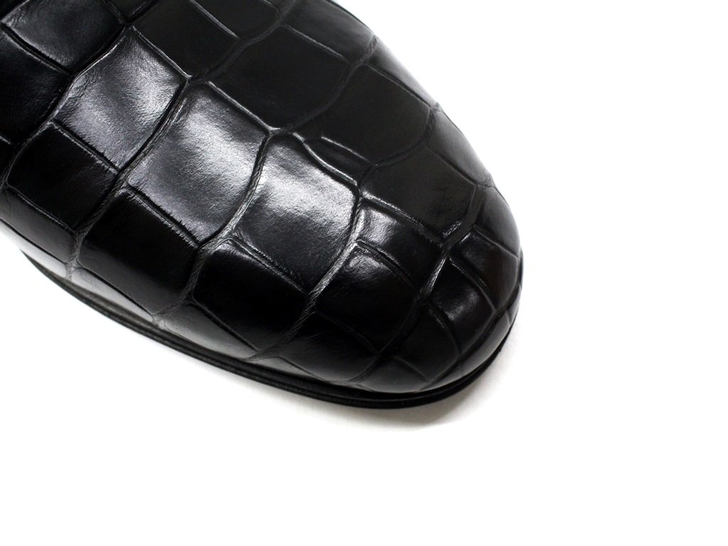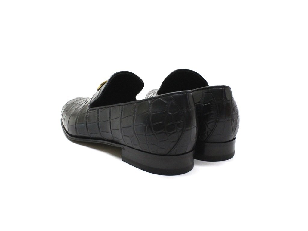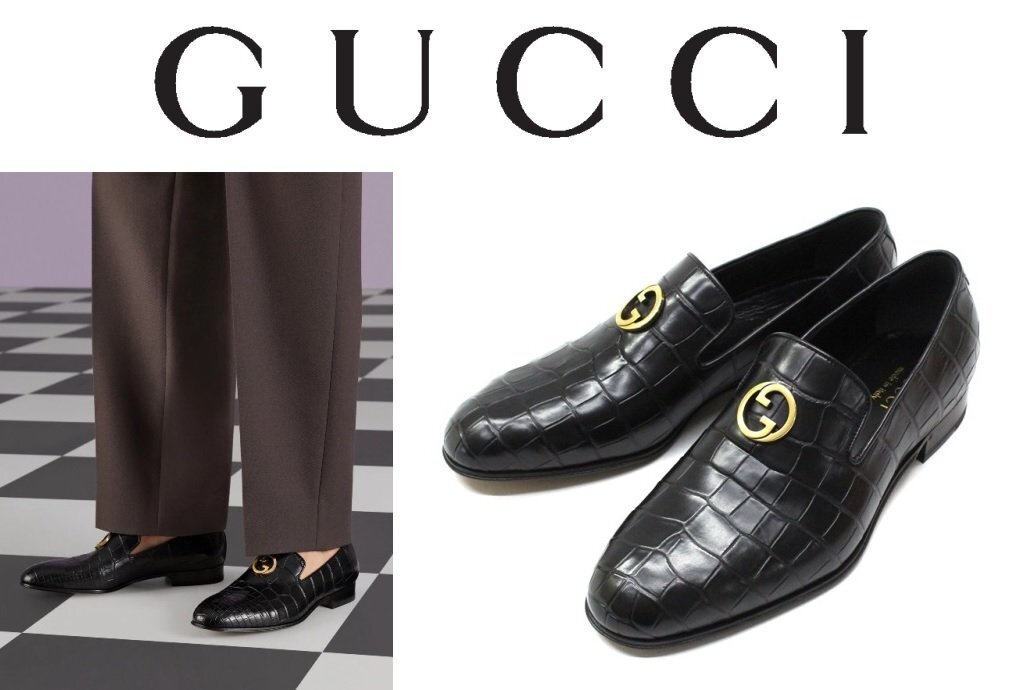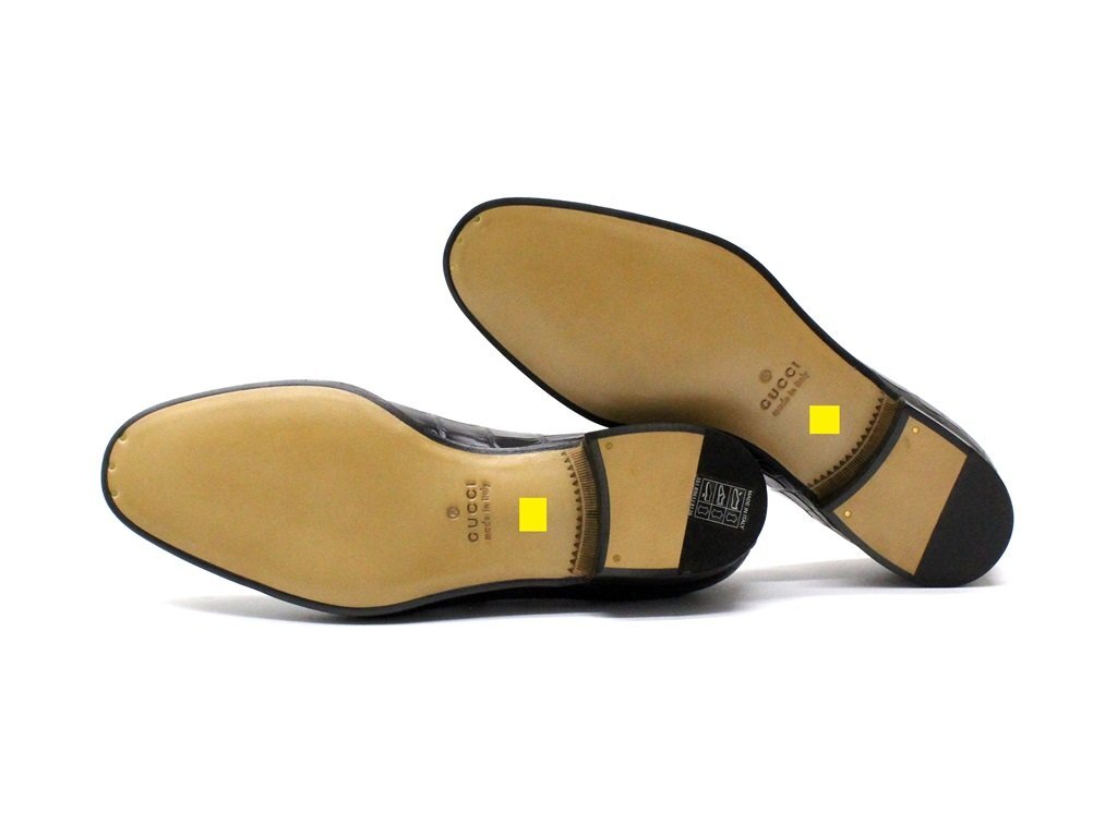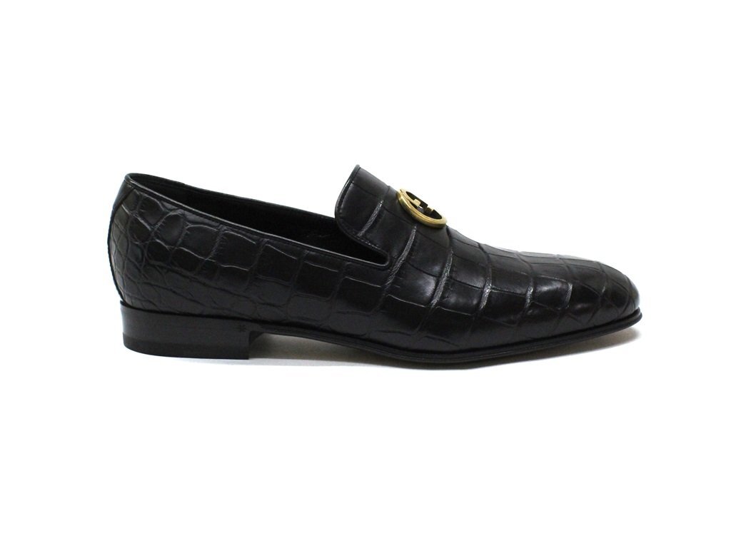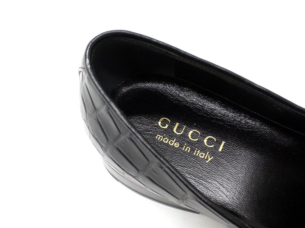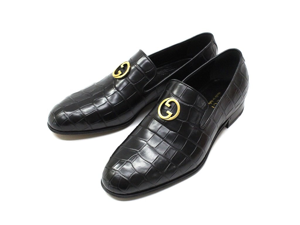 115万新品◆8H=27.5cm◆GUCCIグッチ GGゴールドロゴ 最高級クロコレザーローファーシューズ 黒ブラック