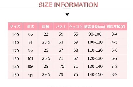 140cmサイズ:着丈106cm / バスト75cm / ウエスト71cm(7-8歳目安)