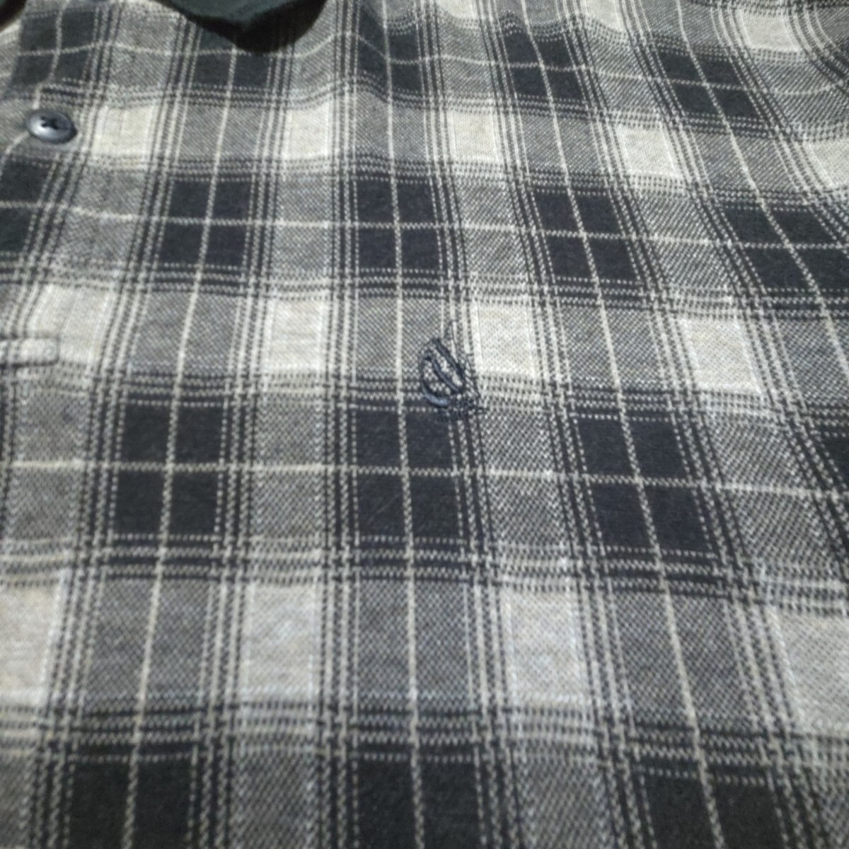 ブラック × グレー系の落ち着いたオンブレチェック柄に、襟・袖リブは無地の切り替えデザイン。