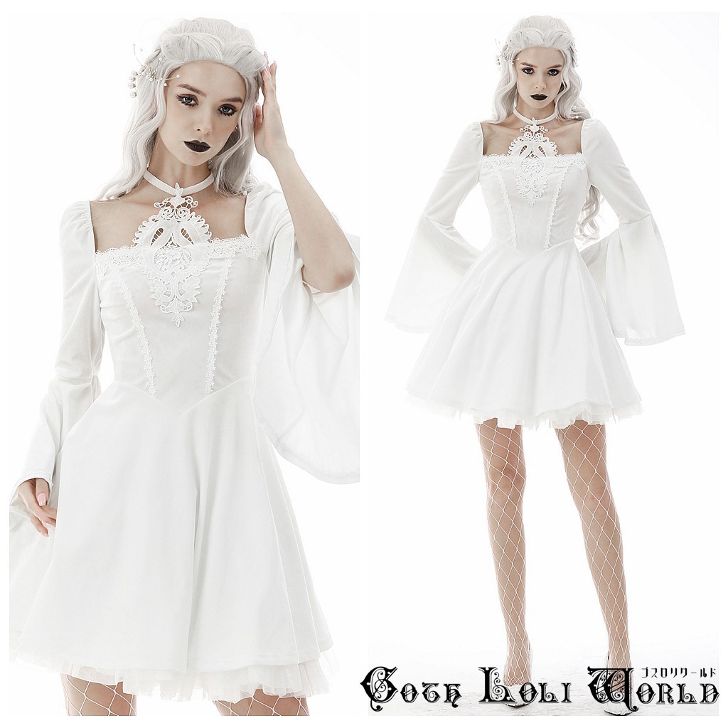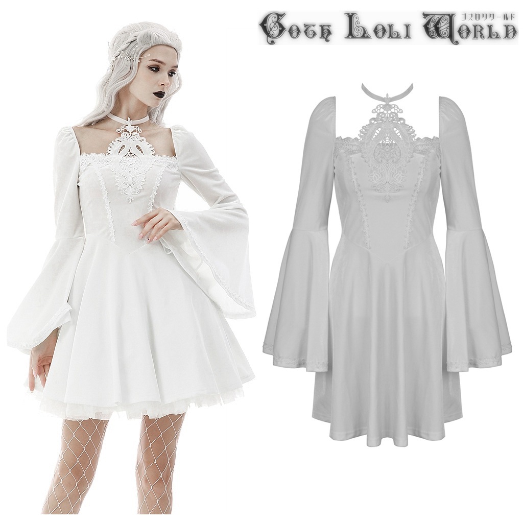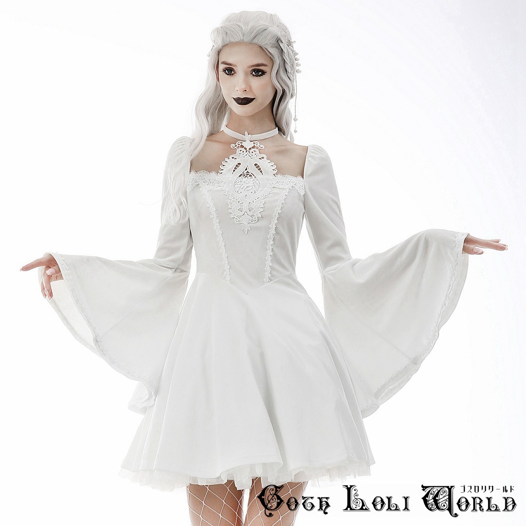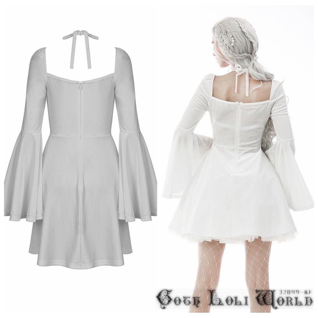 DW594-WH-M スロリスクエアネックベルスリーブベロアワンピース 白色 ゴスロリワールド ゴシック パンク ロック ロリィタ ビジュアル系 V系