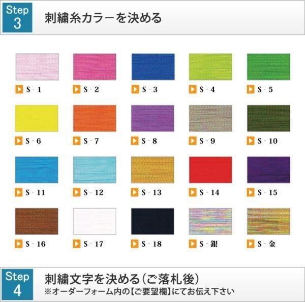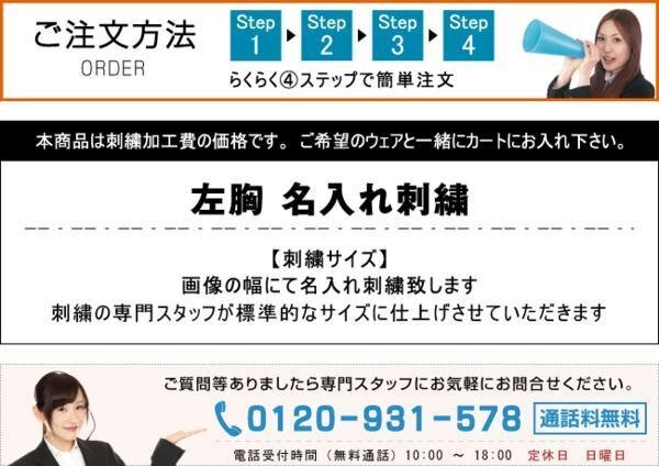 | 商品説明 ご注文方法 ‐簡単STEP‐ | 説明:会社名、チーム名、サークル名。ニックネームや個人名など。 ニーズに様々な形で表現できる刺繍! 当店のネーム刺繍は専用針で細かく打ちますので、仕上がりの艶やかさとクオリティが違います! STEP.1:名入れ商品を決める ※本商品は刺繍加工費の価格です。ご希望のウェアとご一緒にご落札下さい。 ↓ STEP.2:文字書体を決める ↓ STEP.3:刺繍糸カラーを決める ↓ STEP.4:刺繍文字を決める(ご落札後) ※ご落札後、オーダーフォーム内の【ご要望欄】にてお伝え下さい。 ★見栄えがいい文字数は8文字程度となります。 | お支払方法 | 1.Yahoo簡単決算 2.代引き 3.銀行振込み (ゆうちょ銀行 楽天銀行 三菱東京UFJ銀行) ※三菱東京UFJ銀行につきましては弊社のシステム上、入金確認に時間を要しますので予めご了承下さい。 |