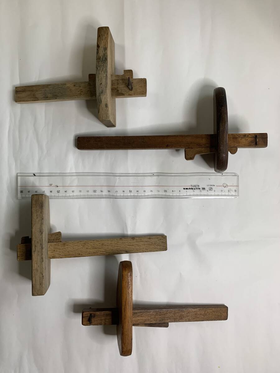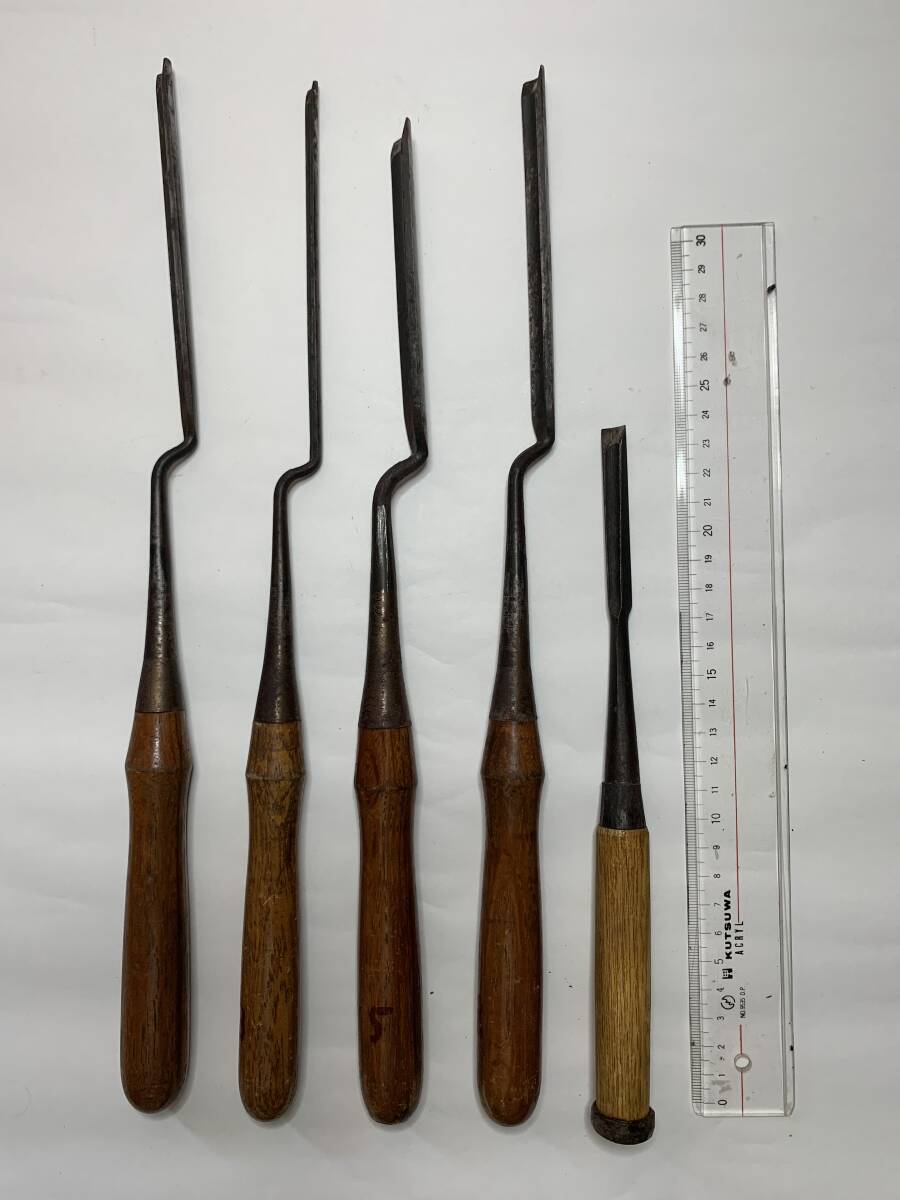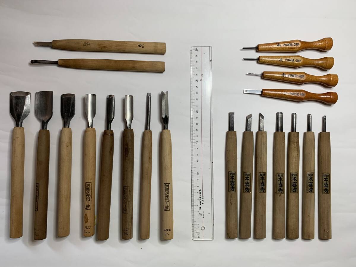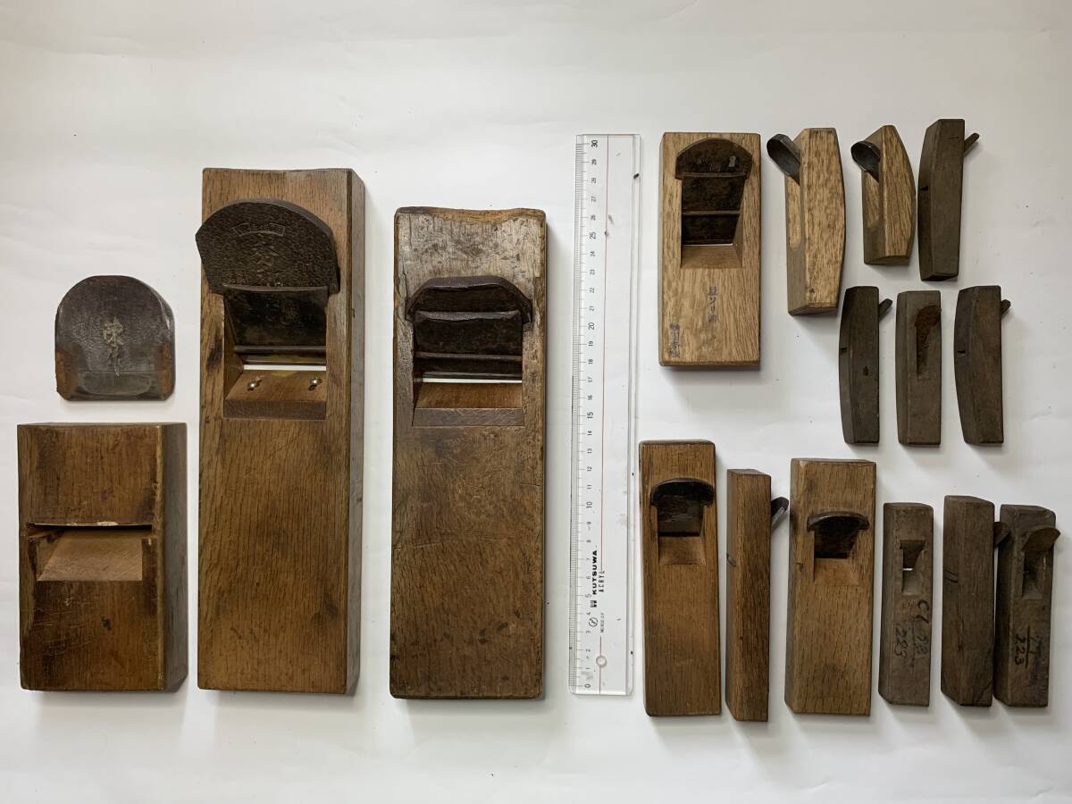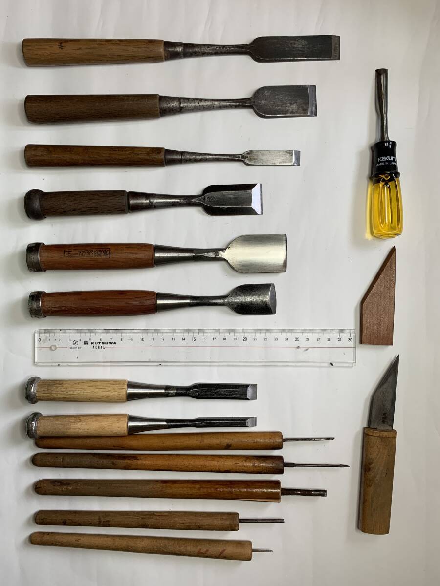 木工用の鑿(叩き鑿・突き鑿)・彫刻刀・鉋・毛引です。 鉋の台も痛んでいます。毛引の一丁は止めるための部品が折れていて、作り直しが必要です。錆や刃先の欠けが有る物もあります。写真で見て頂ける現状でのお渡しになります。