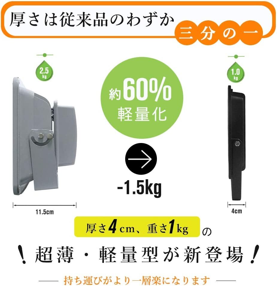 ◆軽薄化LED投光器:1KGの軽量だから壁への負担を掛けずに壁掛けが可能、駆動内蔵設計で投光器の厚さはわずか4CMでよりスッキリと設置できます。