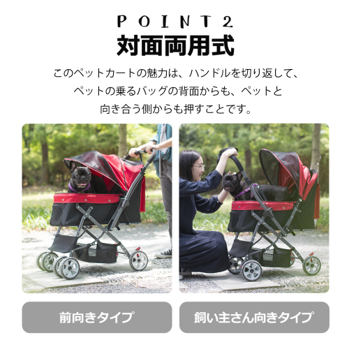 • ●対面式の設計で愛犬の顔を見ながら、散歩しましょう。◆足踏みストッパー付きで、休憩や坂道でカートを止める際も安心!