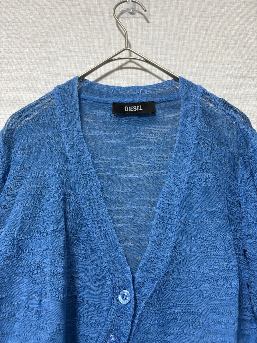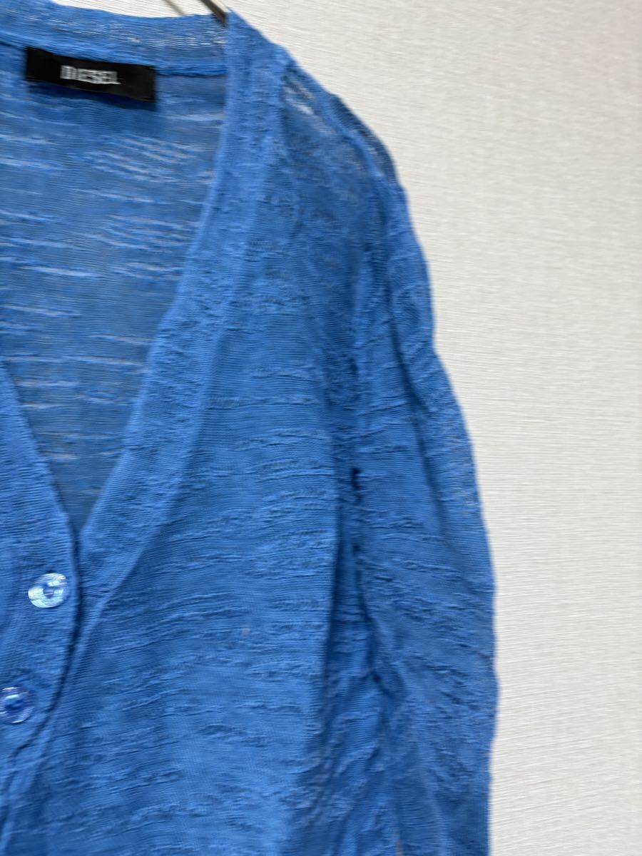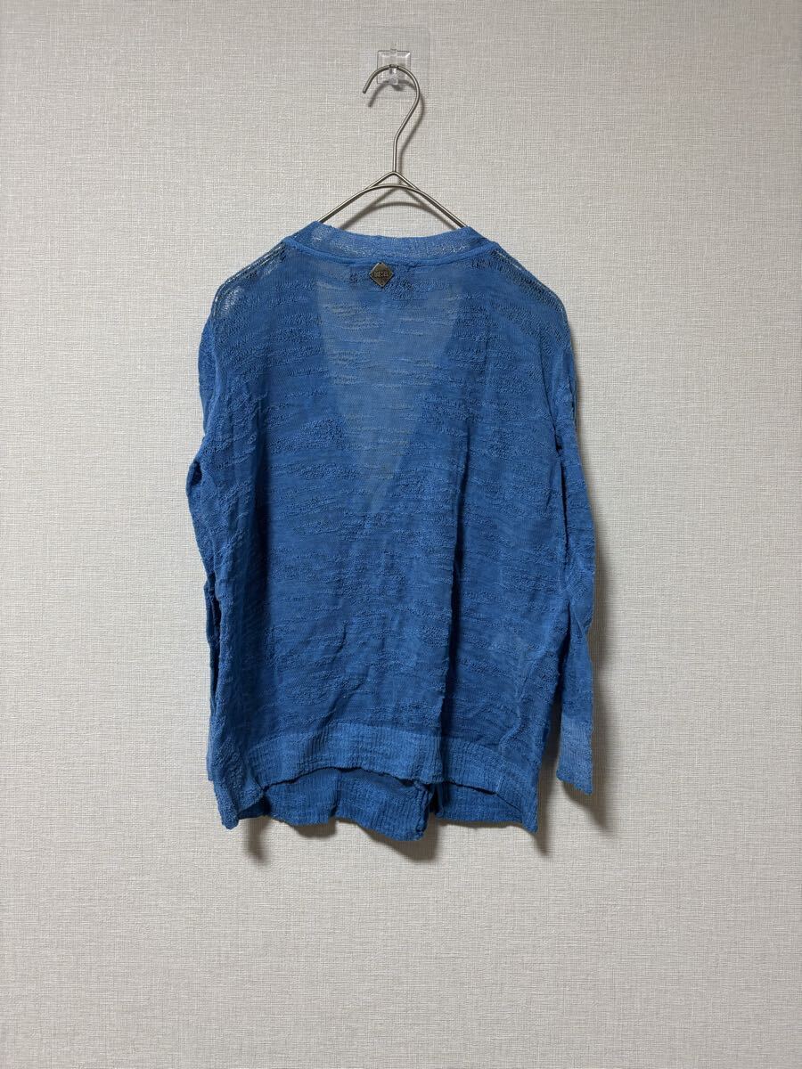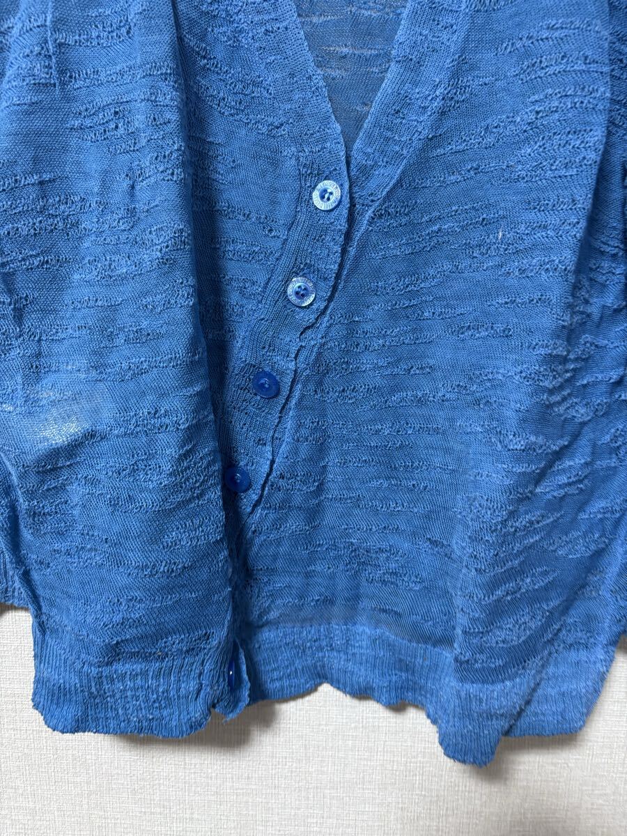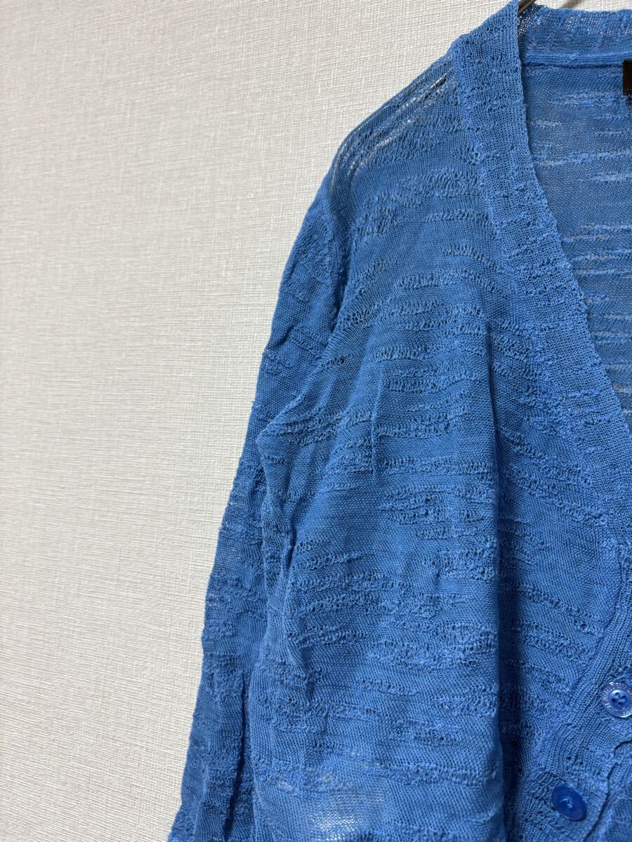 薄手のニット素材で、爽やかな青色のVネックカーディガン。