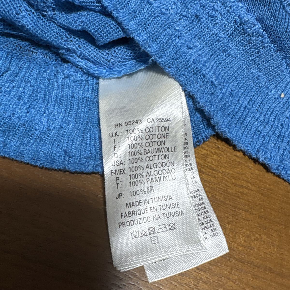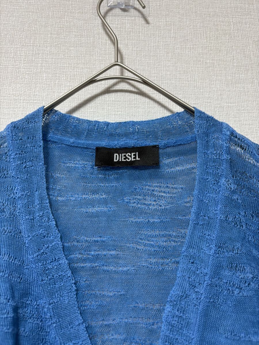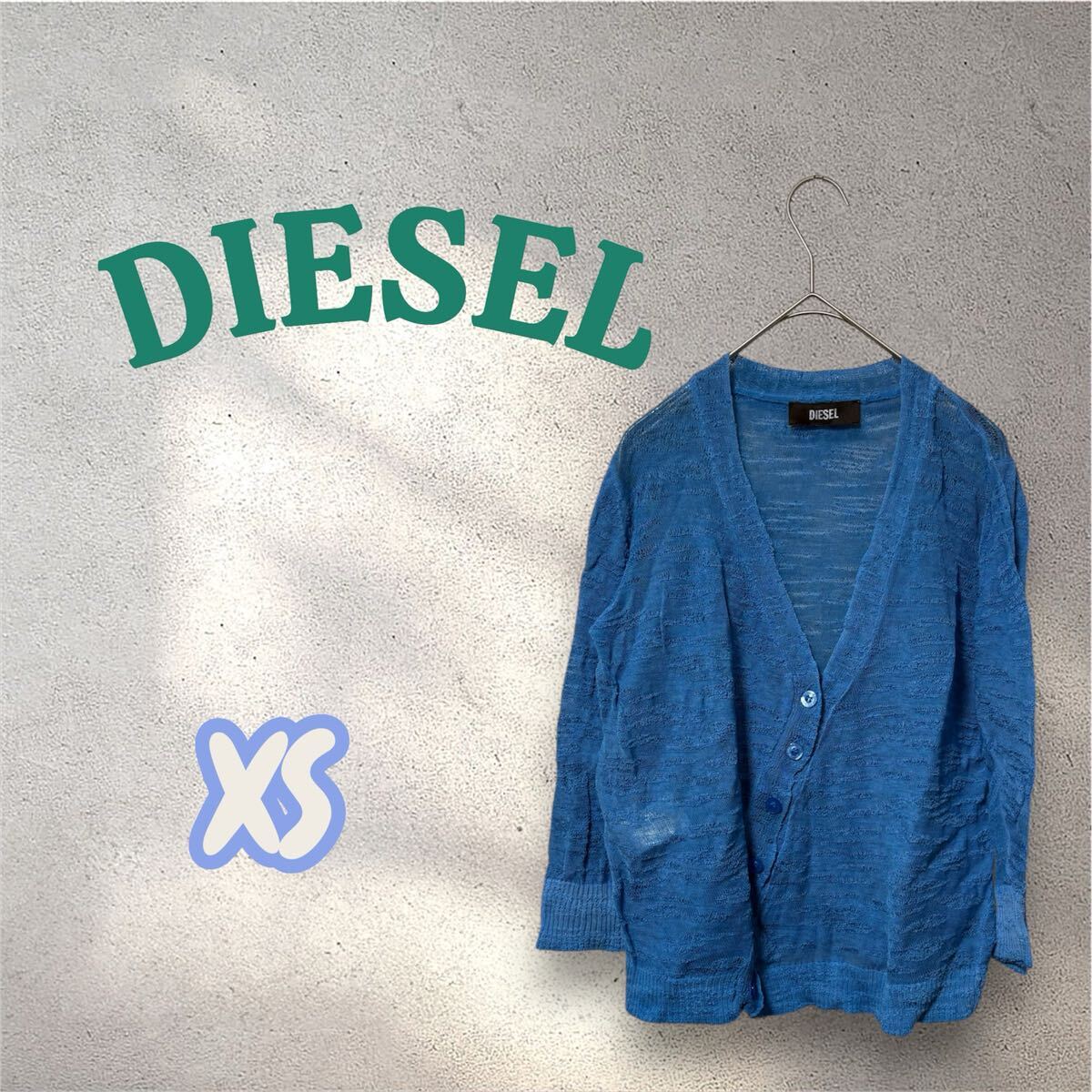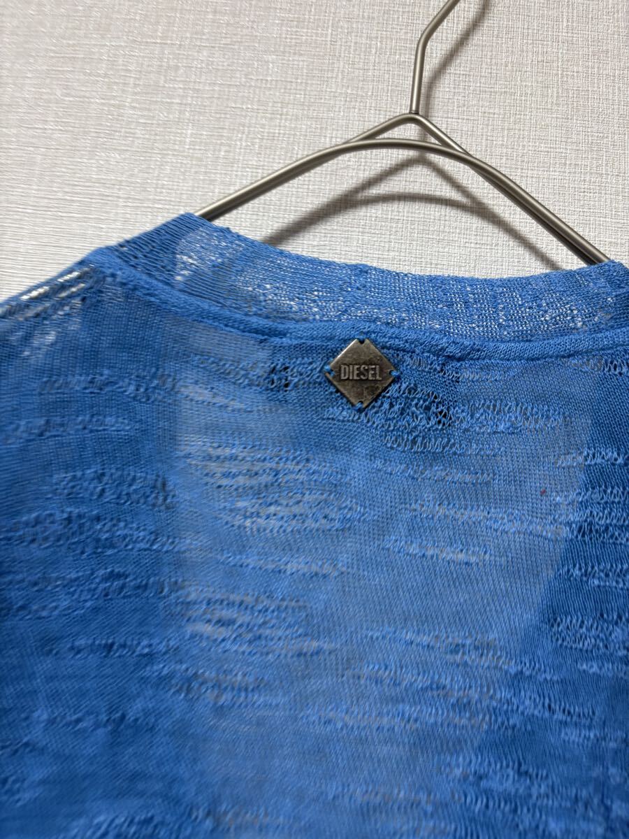 薄手のニット素材で、爽やかな青色のVネックカーディガン。