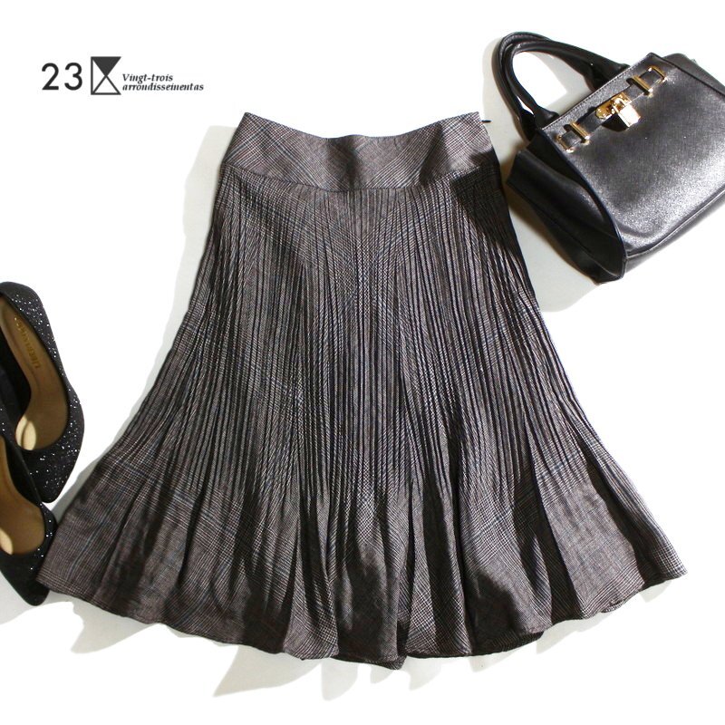 美品 23区 株)オンワード樫山 秋 冬 チェック 柄 羊毛 カシミヤ シワ プリーツ フレアスカート ウールスカート 30 ダークブラウン スカート