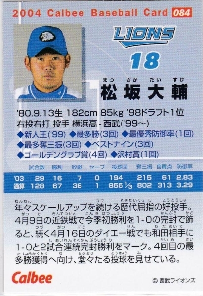 ●2004カルビー【松坂 大輔】 BASEBALL CARD No.084:西武 R2