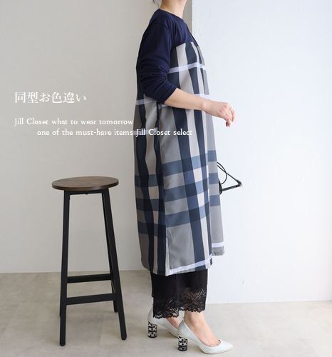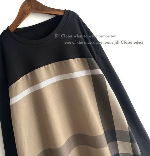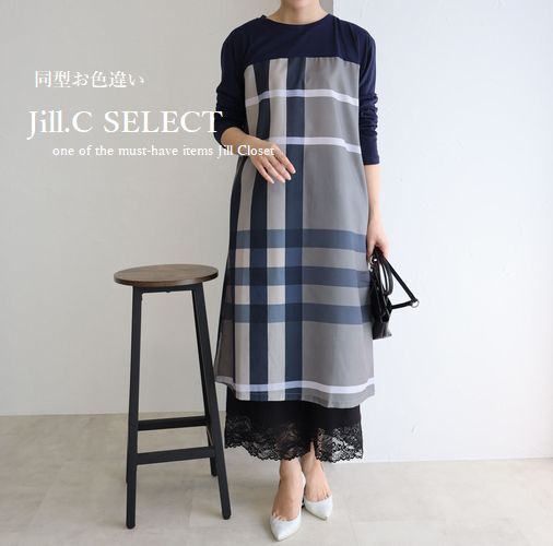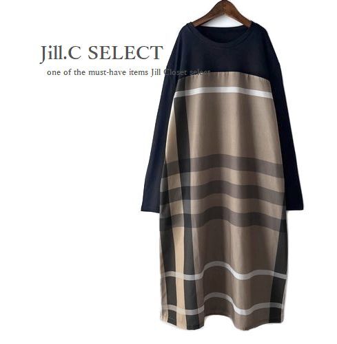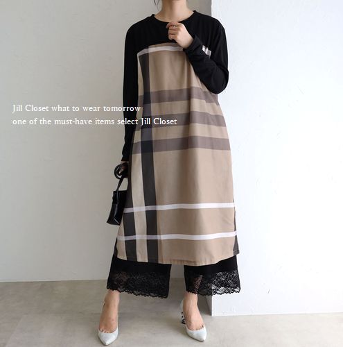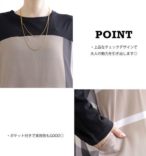 新品【送料185円】伸縮◎トラッドチェック柄*異素材切り替えデザイン*シームポケット付き*プルオーバー*チュニック*ワンピース6617.BLACK