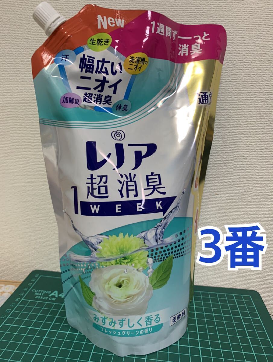 3番 レノア超消臭1WEEK (みずみずしく香る)フレッシュグリーンの香り 柔軟剤 詰替用 1520mlを1袋です。