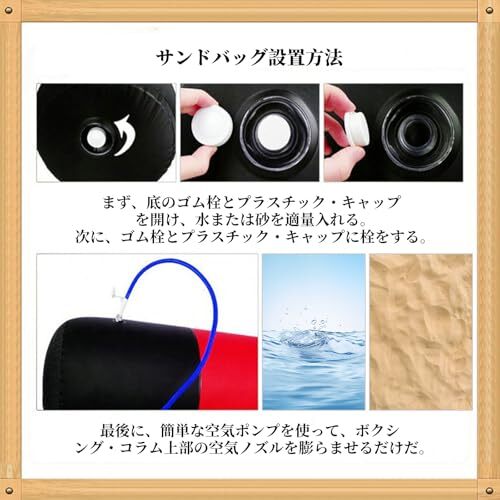【室内トレーニングソリューション】:この製品の主な利点の1つはその多機能性である。室内や屋外で使用でき、あらゆる生活空間や環境に適しています。空気入りサンドバッグには空気入れが付いており、数分以内に簡単に設置して空気を入れることができます。そのコンパクトなサイズは、使わないときにも収納しやすい。