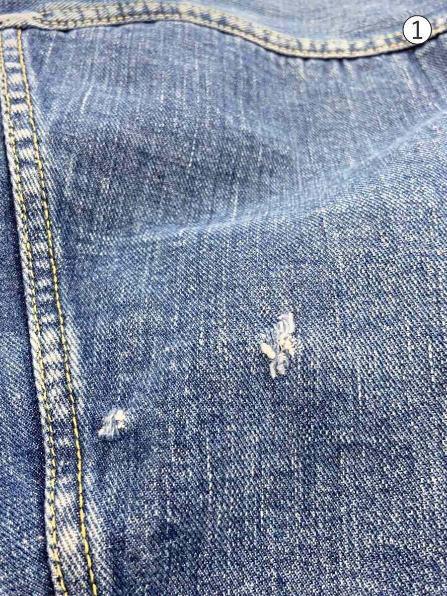 | (1)穴あり 多少着用によるダメージ等があり、一般的な着用感のあるお品物です。 (写真にてご確認ください) ※商品には写真では確認しづらいダメージや汚れがある場合がございます。 商品について気になる点がございましたら販売店舗まで(必ず汚れやダメージがある部分と内容を記入) お問い合わせくださいませ。 |