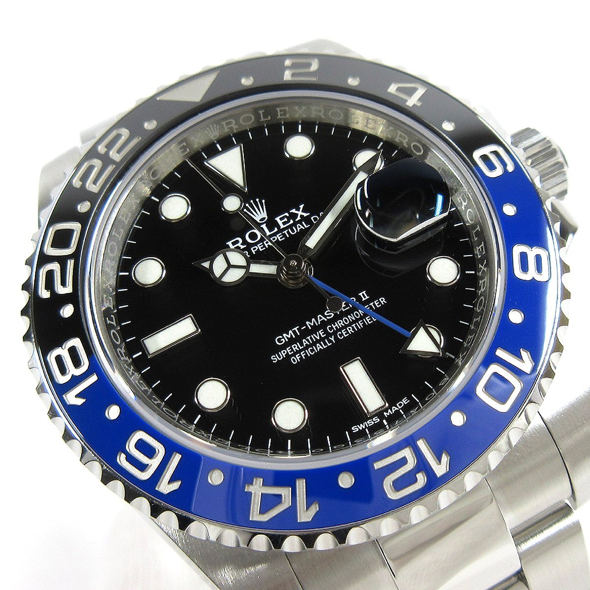 定番人気のGMTマスターII(生産終了モデル)。 キラリと輝く青黒セラミックベゼル。