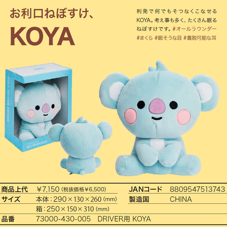 【商品特徴】 <お利口ねぼすけ「KOYA」> 利発で何でもそつなくこなせるKOYA。 考え事も多く、たくさん眠るねぼすけです。 #オールラウンダー #まくら #眠そうな目 #着脱可能な耳 【商品詳細】 ●状態:新品・未使用品 ●材質:ポリエステル ●タイプ:ドライバー用(460cc 対応) ●サイズ:290x130x260 (200) mm ※特殊なヘッド形状の場合は、装着できないことがございます。 ※撮影時の光量の具合や、ご覧いただいております画面環境によりまして、実際の商品と若干色味が違う場合がございます。 ※商品詳細のスペック値はメーカー表記の数値となりますが、個体差による若干の公差がございます。