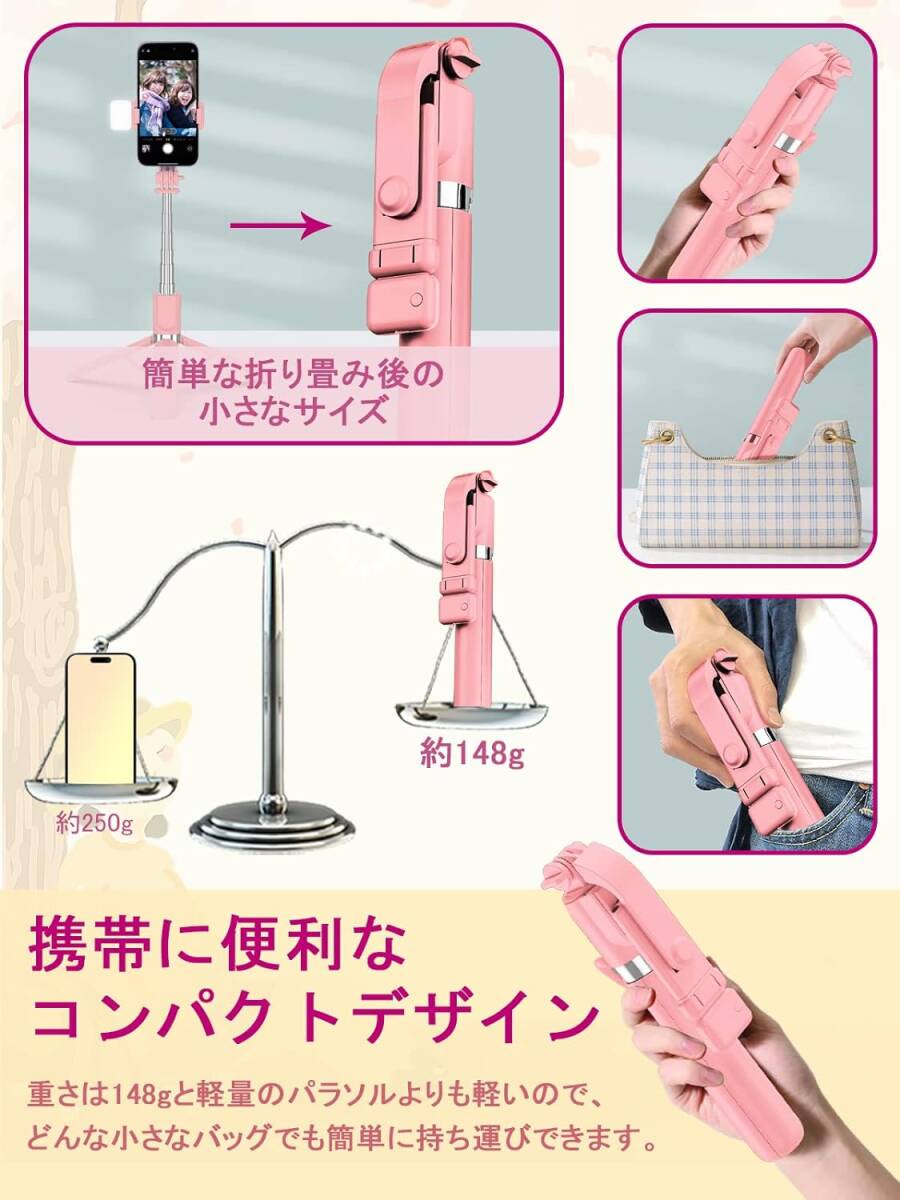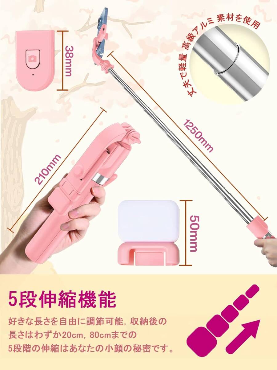 ファッション 高輝度LEDライト付き自撮り棒 三脚/一脚兼用 5段伸縮 折りたた