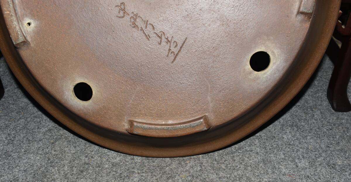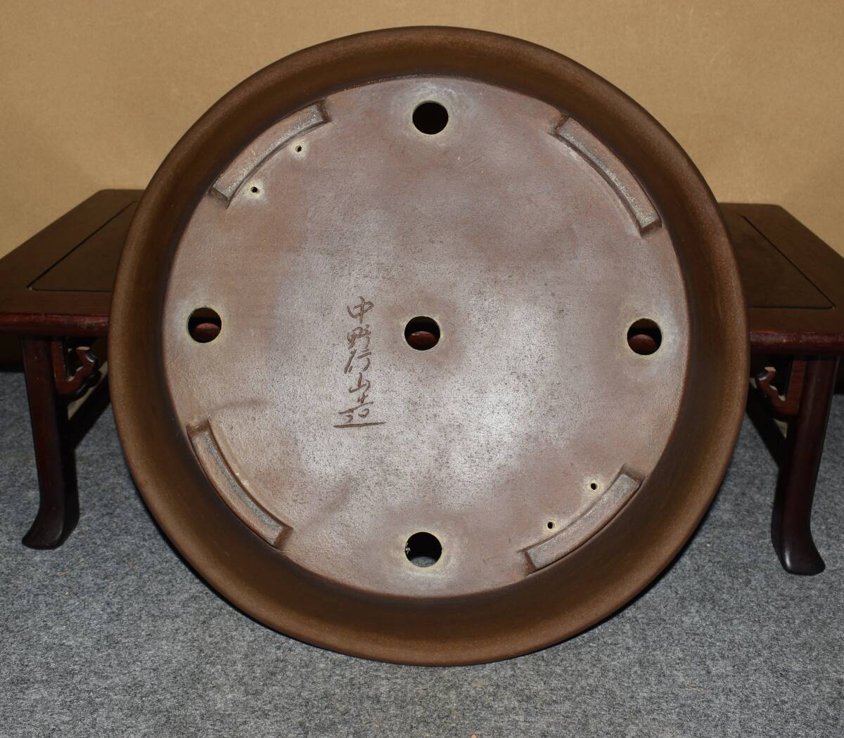 サイズ47,0x10,0cm 人気和鉢作家<初期の中野行山・紫泥・手造り・釘彫落款★時代乗り満点★泥味最高・希少型・大き目サイズ>外縁丸鉢のご紹介です・・松柏、皐月に最適・手造り・何十年も使い込まれ時代乗りは申し分ありません。 紫泥の泥味が良く、実用にも優れた素晴らしい逸品です・目立つ傷はありませんが、最後の画像で分かる様に脚付近に窯があります。・・・ 大変古い物ですので縁・足等にホツ・スジ・カケ等がある場合がございます。 状態を良くご確認の上、ご入札宜しくお願い致します。。画像を良くご確認の上、御入札宜しくお願い致します。完品をお求めの方は入札をお控えお願い致します。*注意事項* オークション終了後48時間以内に必ずご連絡をお願いします。ご連絡がない時は、ご購入意思がないと判断し、落札者さま都合のキャンセルとさせて頂きます。再三のご連絡を差し上げても、ご連絡がない場合は、時点繰り上げとさせて頂きます。マイナス評価の多い方や新規の方を削除する場合がありますので、ご了承下さい。また、入札価格が低価格の場合は取消終了とさせて頂く場合がございますので、ご了承願います。古い物等ございますので小さな傷等は、見落とす場合がございますので、写真を良くご覧になり納得の上ご入札して下さい。また、完品をお求めの方は入札をお控えお願い致します。キズ・破損等のご連絡は商品到着5日以内にご連絡ください。それ以降は対応致しかねますので到着後、商品を必ずご確認ください。輸送中の事故(鉢が割れる、枝が折れる等)につきましては商品到着時に確認し取引ナビまたは、お電話にてご連絡下さい。 基本土日の発送は行っておりません。ご了承ください。