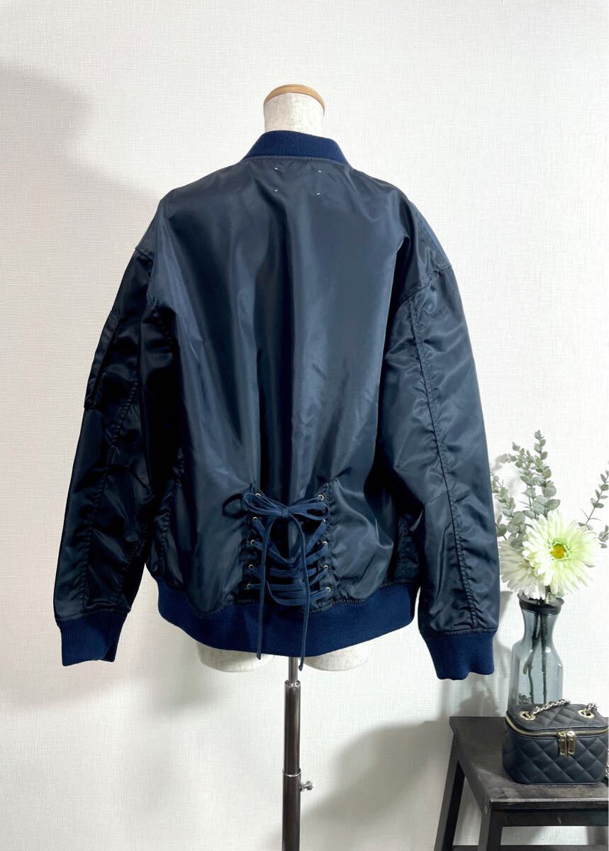 一見ベーシックな普通のMA-1ブルゾンですが、バックデザインに編み上げのデザインを配しフェミニンな要素をプラス。
