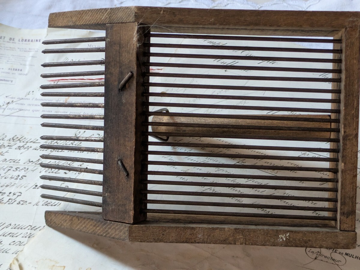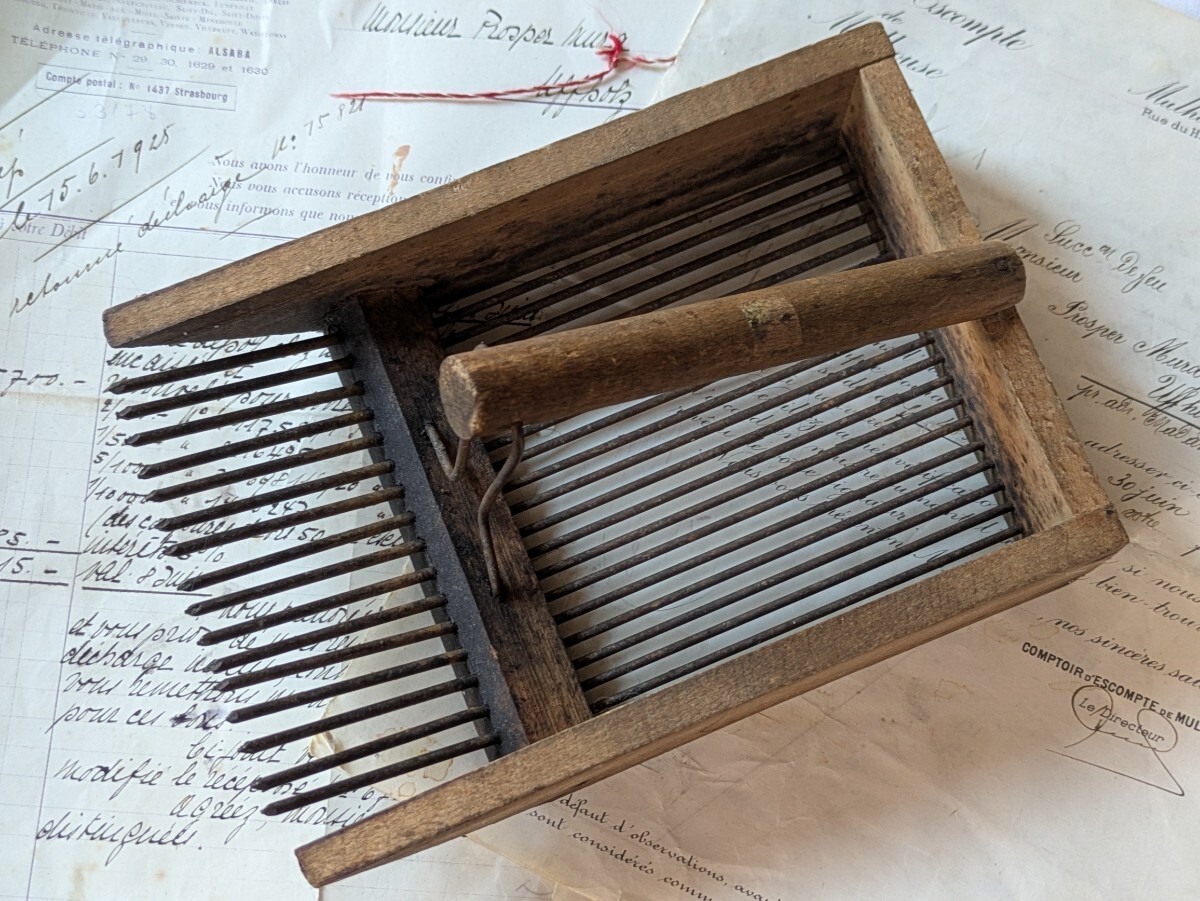 枝に梳くように差し込み、軽く引くことで実を傷つけずに集められる仕組みで、18世紀頃のヨーロッパ(アルザス地方の文書から)のデザインを思わせるアンティーク品です。