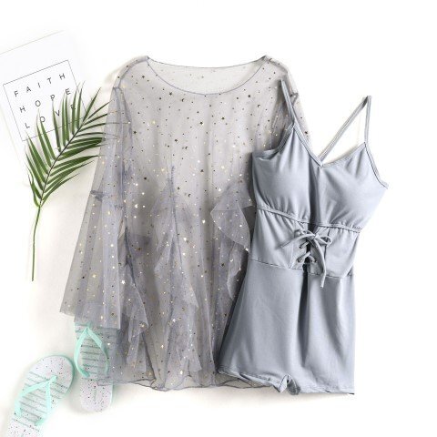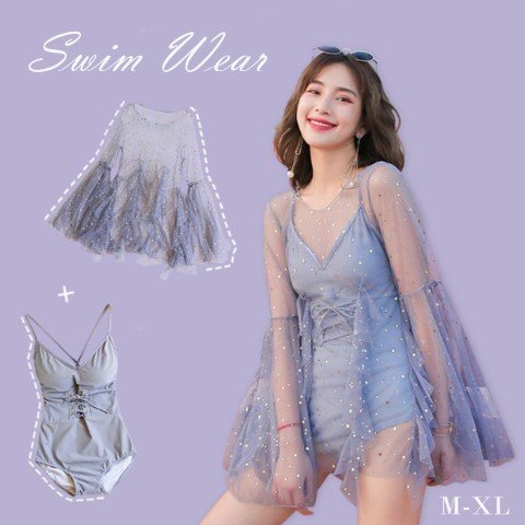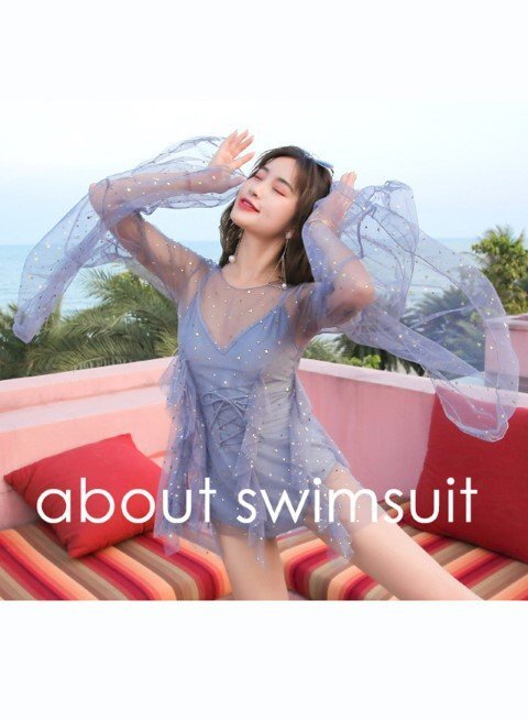 レディース水着 ワンピース水着 透け感 チュニック ラメ かわいい キラキラ XL ブルーグレー