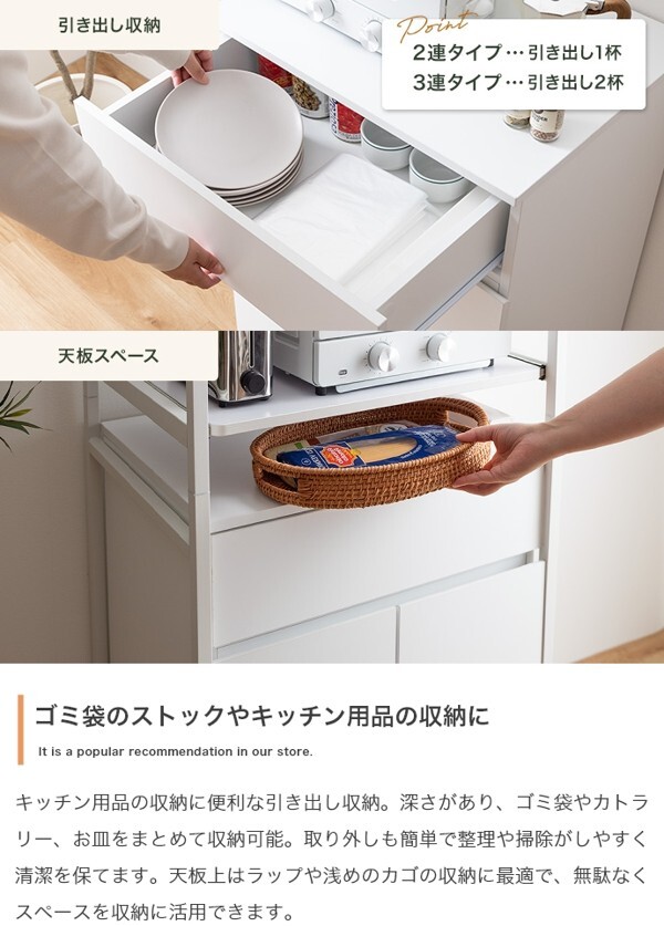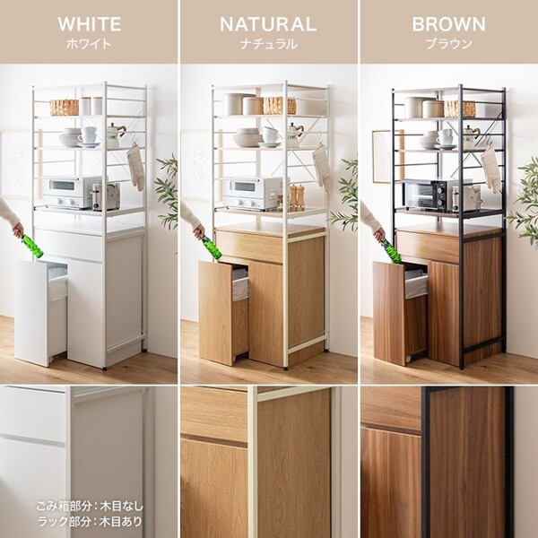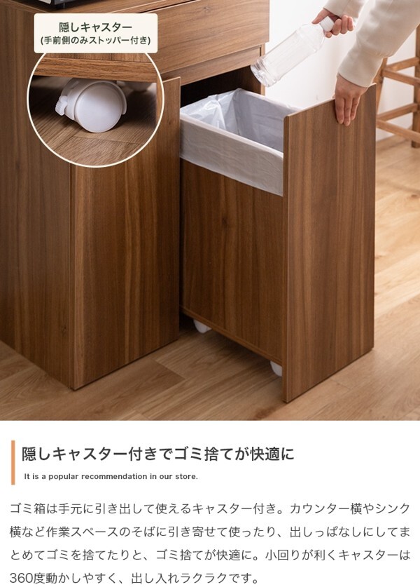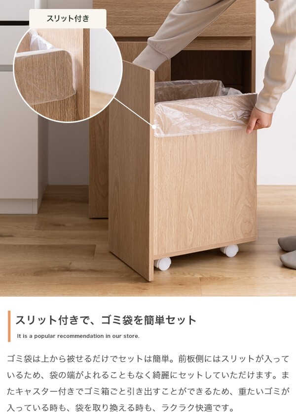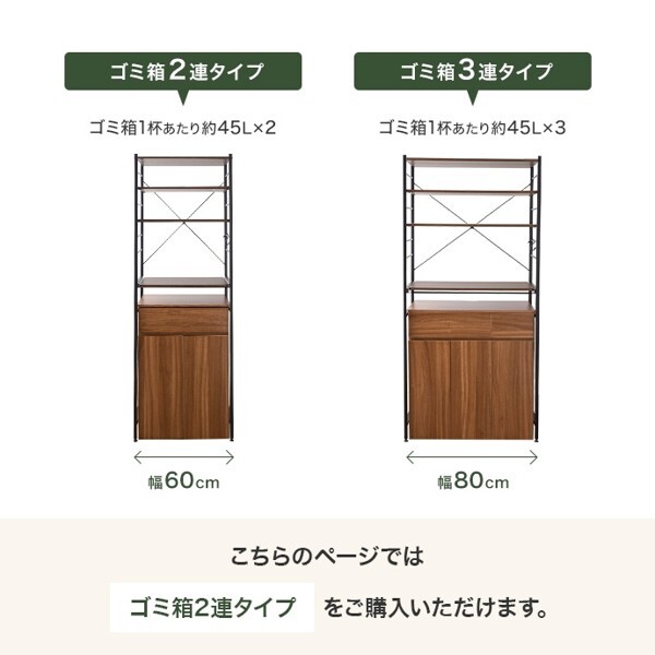 ※現在ご覧の商品ページはナチュラルのご購入ページとなります。 ヤフオクの仕様上単一ページに複数バリエーションを掲載することができませんので、他バリエーションが希望の場合は別ページでご購入お願い致します。 ゴミ箱に見えないデザインと使いやすさが魅力のゴミ箱付きキッチンラック。 シンプルなデザインでどんなインテリアにもなじみます。 分別がしやすい2連・3連タイプを用意し、面倒なゴミ捨てもスムーズ。 隠しキャスター付きのゴミ箱に加え、炊飯器やポットの収納に便利なスライドトレーや、使い勝手の良い可動式収納棚も備え、機能性も抜群です。 配達業者を指定いただくことはできません。 沖縄・離島に関しましては、別途配送料が必要となります。 北海道への配送も別途配送料が必要になる場合がございます。 ※別途送料が発生する場合は後ほどご連絡させていただきます。 タイミングによっては在庫切れの場合があります。