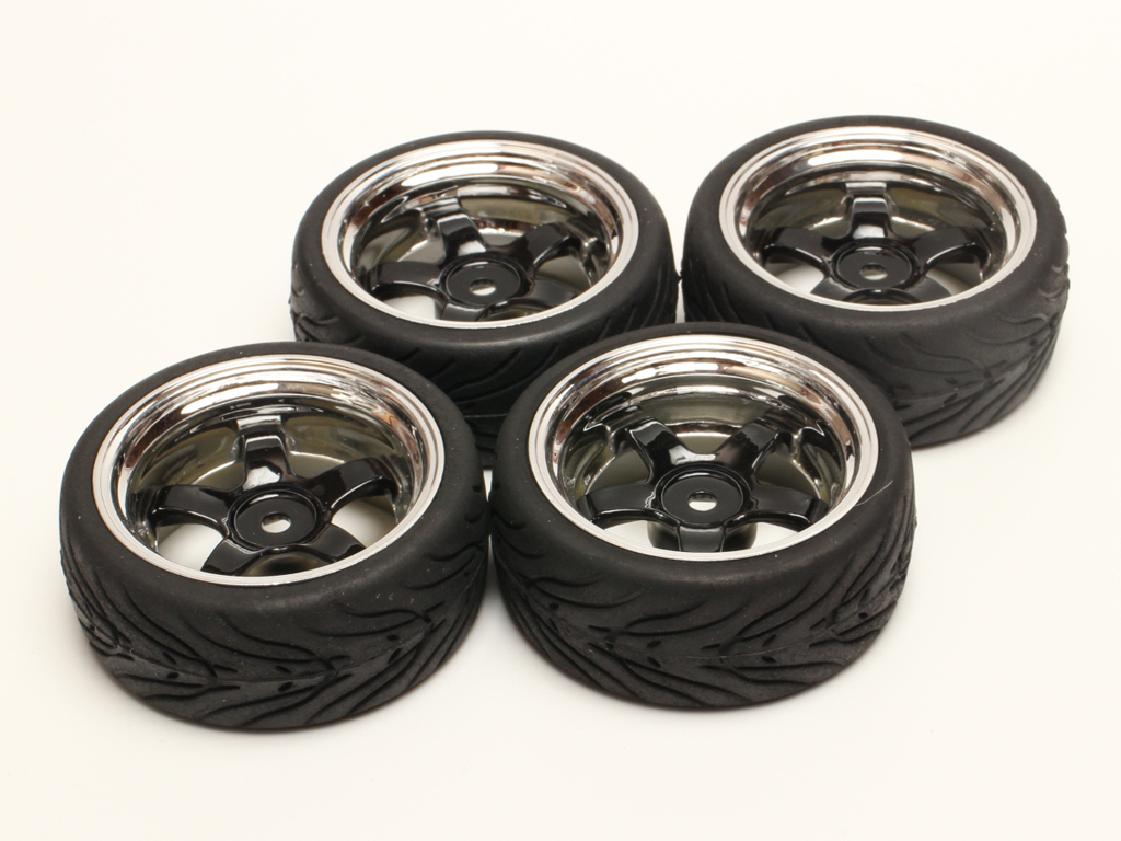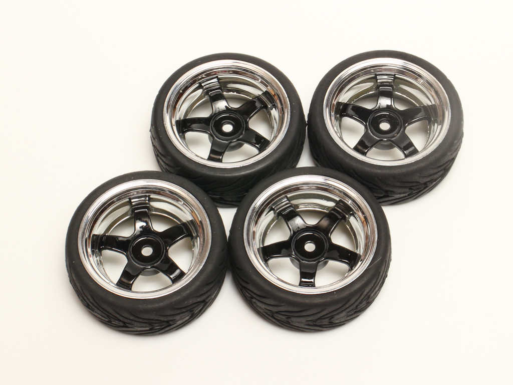 1/10 旧車向け ラバータイヤ組込済み 激深リム クローム/ブラック5スポークホイール4本セットです。