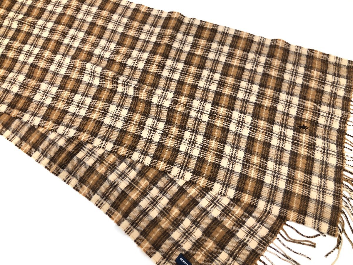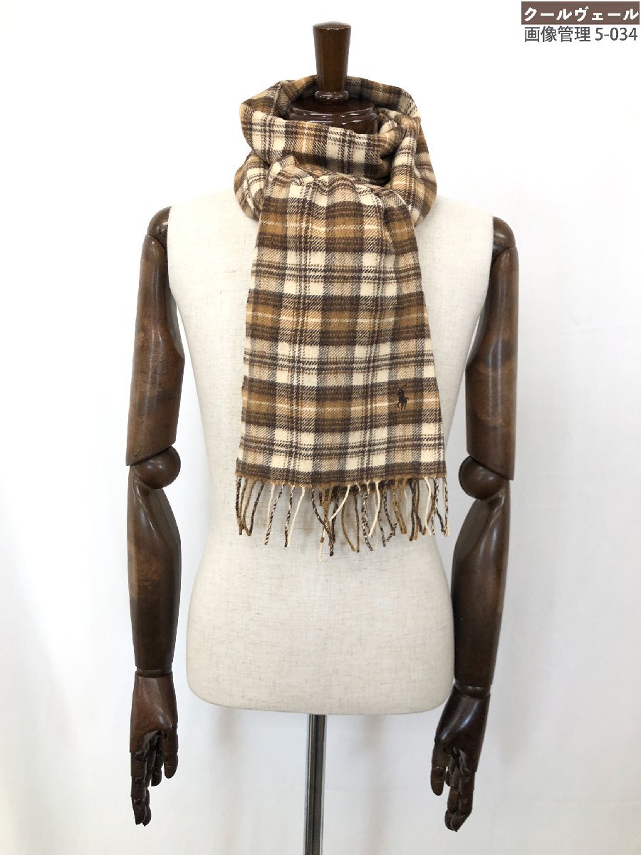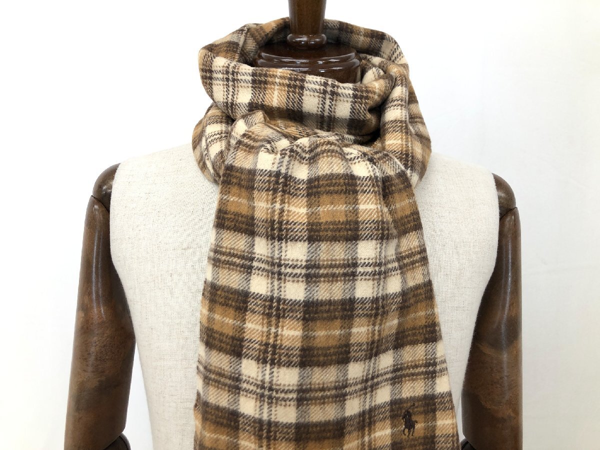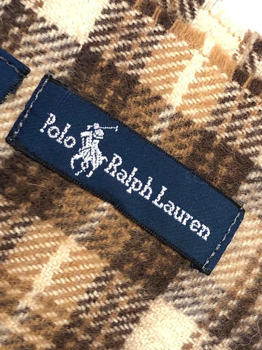 超美品【ポロラルフローレン】 キャメル100% チェック柄 ロングマフラー ストール (メンズ) ブラウン×アイボリー系 英国製 ◇33ME7771◇