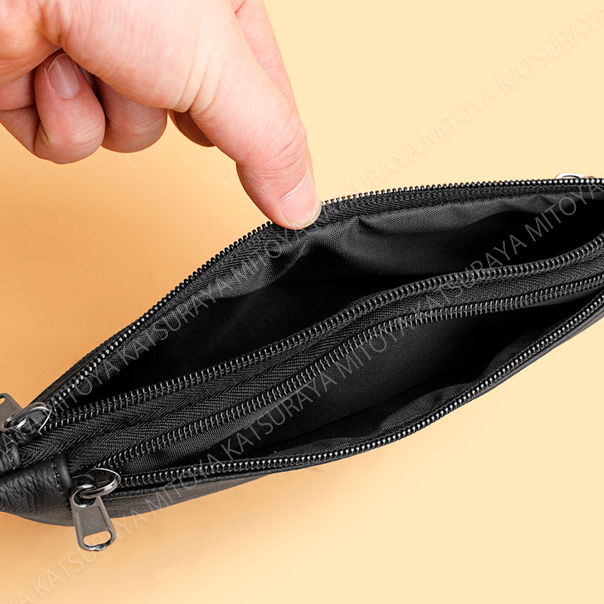 薄くてスマート。荷物の少ない時に最適。混雑する場所に出かけるとき等におすすめアイテムです。シボのある本革を採用しキズや汚れが目立ちにくく手触りもなめらかです。バックル式のベルトで取り付け取り外しが容易、肩掛けに斜め掛けにと自在に変更できます。長財布は収まりませんが横に広いファスナーポケットがあるので、本体自体をお財布として使用しても使い勝手がよいです。