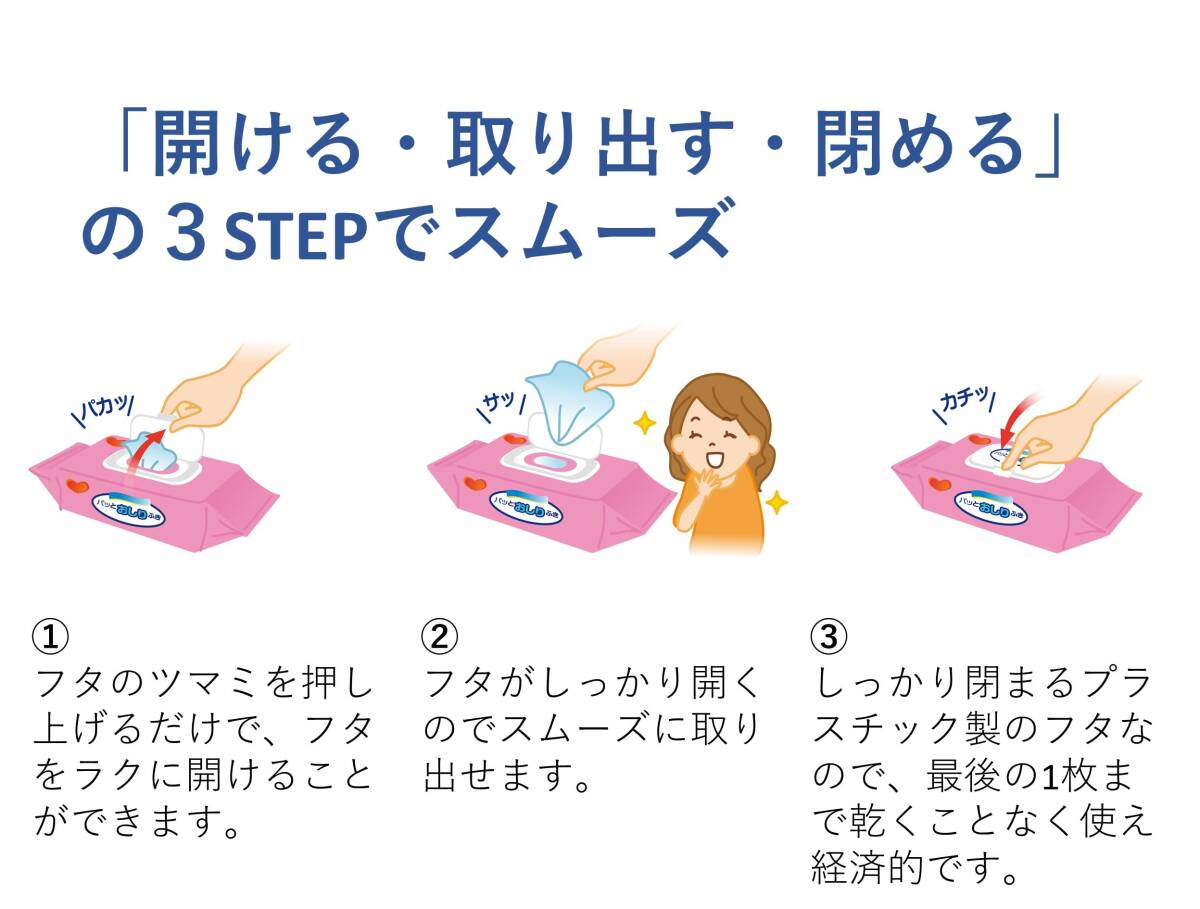 商品紹介【商品紹介】●汚れをしっかりキレイに拭きとります。●一枚ずつスムーズに取り出せ、パッと広がりすぐ拭ける。おむつ交換の際のおしりケアが手間をかけずに清潔にできます。●ふんわりとしなやかな肌触り、丈夫で破れにくい特長に加え、水にすばやくほぐれるという特長を兼ね備えています。●ポータブルトイレ使用時にも便利。●開ける、閉める、取り出すがスムーズに出来るので、介護する方される方、両方の負担軽減に繋がります。●パカッとオープン。フタのツマミを押し上げるだけで、フタをラクに開けることが出来ます。●カチッとロック。しっかり閉まるプラスチック製のフタなので、最後の1枚まで乾くこと無く使え経済的です。●ふんわりした優しい肌触り。デリケートなお肌を傷つけることなく優しく汚れを拭き取ります。(保湿成分配合)●使った後はトイレに流せる。水流でバラバラにほぐれる水解性特徴により、ニオイが気になる使用済みのシートもすぐに処理できます。●無香料、無着色、ノンアルコール、PGフリー、パラベンフリー。刺激が少ないノンアルコールなので、手や身体にも使えます。【使用上の注意】●お肌に異常がある時やお肌に合わない場合には、ご使用をおやめください。●目や粘膜および傷口には使用しないでください。●中身の乾燥を防ぐため、ご使用後はしっかりとフタを閉め、なるべく早めにご使用ください。●乳幼児の手の届かないところに保管してください。●直射日光にあたる場所や、高温のところには保管しないでください。●内容成分(原材料)のにおいが感じられる場合がありますが、品質には問題ありません。●トイレに流す場合は、1~2枚ずつ大量の水で流してください。このティシュは水流の力でほぐれるので、水流が弱いとトイレに詰まる可能性があります。【材質】パルプ、レーヨン【成分】水、BG、フェノキシエタノール、安息香酸Na、ヒドロキシエチルセルロース、エチドロン酸、 セチルピリジニウムクロリド、ジラウロイルグルタミン酸リシンNa、エチドロン酸4Na【サイズ】180×190?【製造国】 日本原材料・成分成分/水、BG、フェノキシエタノール、安息香酸Na、ヒドロキシエチルセルロース、エチドロン酸、 セチルピリジニウムクロリド、ジラウロイルグルタミン酸リシンNa、エチドロン酸4Na