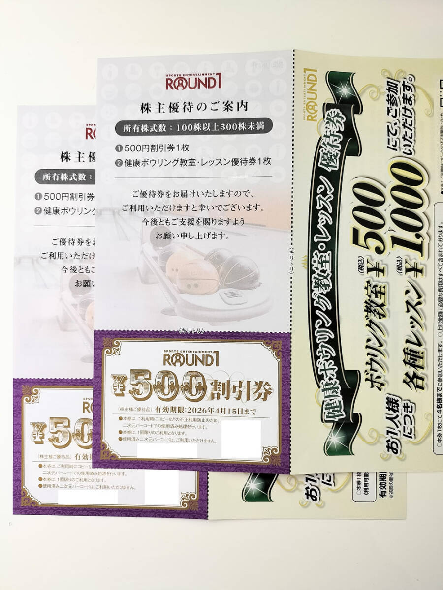ラウンドワンの株主優待券です。 【商品詳細】 ・500円割引券:2枚 ・ボウリング教室・レッスン優待券:2枚