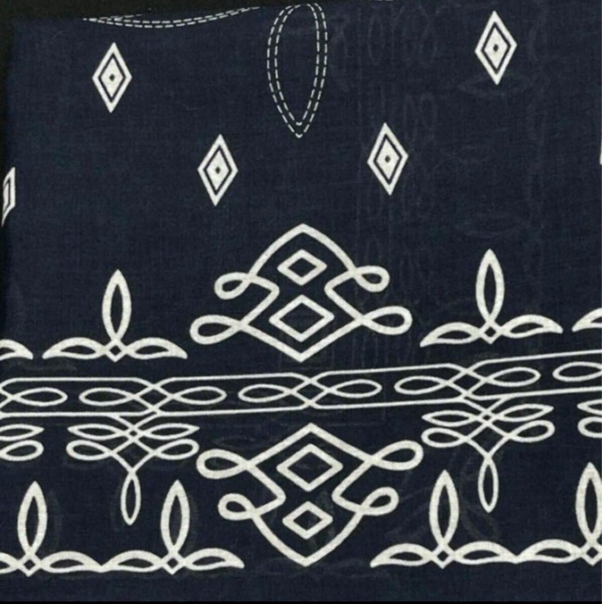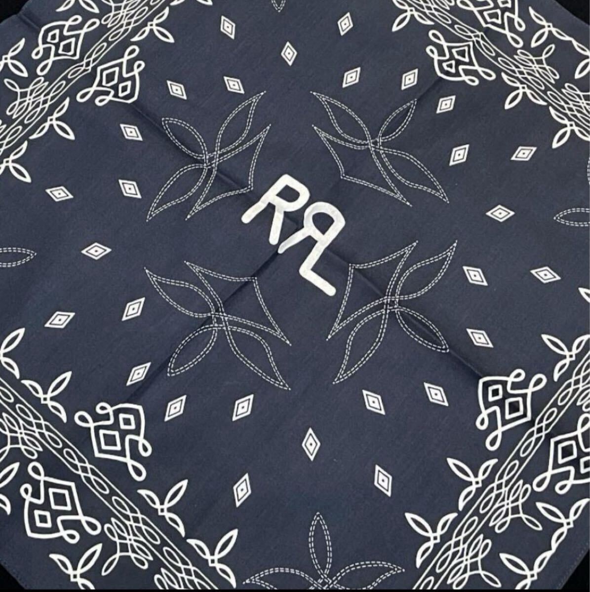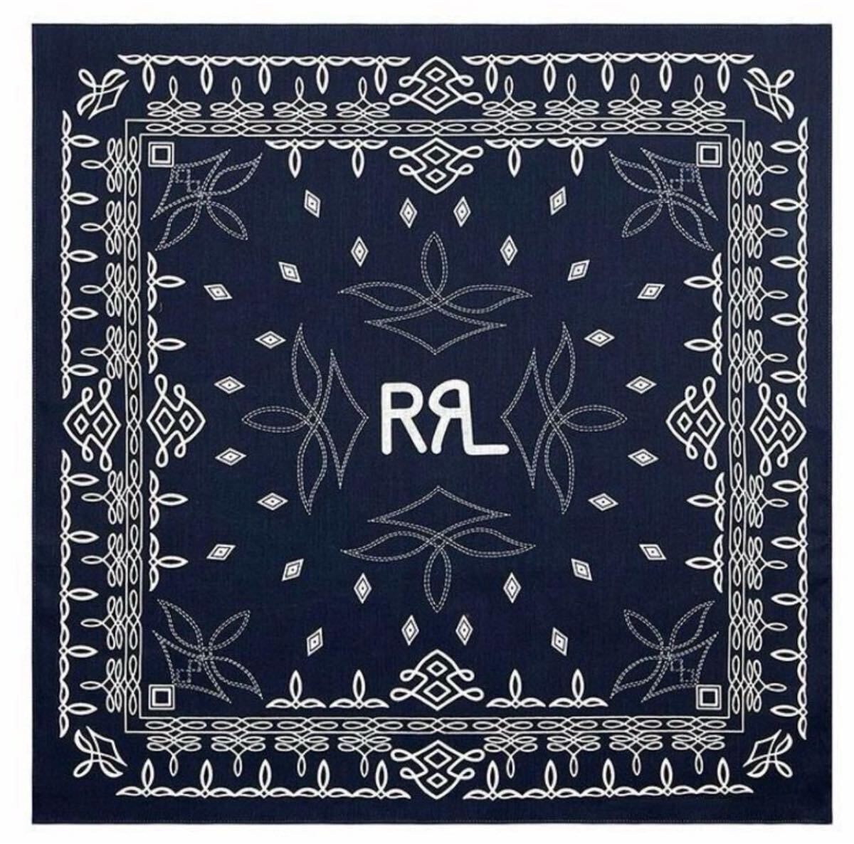 ネイビーベースにホワイトの模様が映える、クラシックな雰囲気の大判バンダナです。中央には「RRL」テイストのロゴデザイン入りで、アメカジやヴィンテージファッションとの相性も抜群。