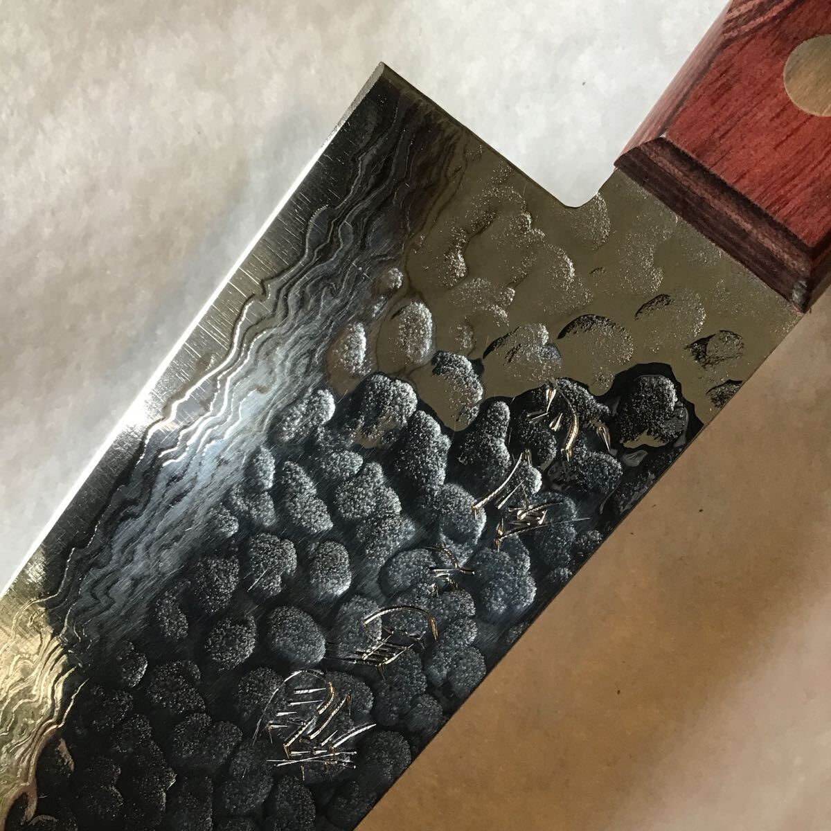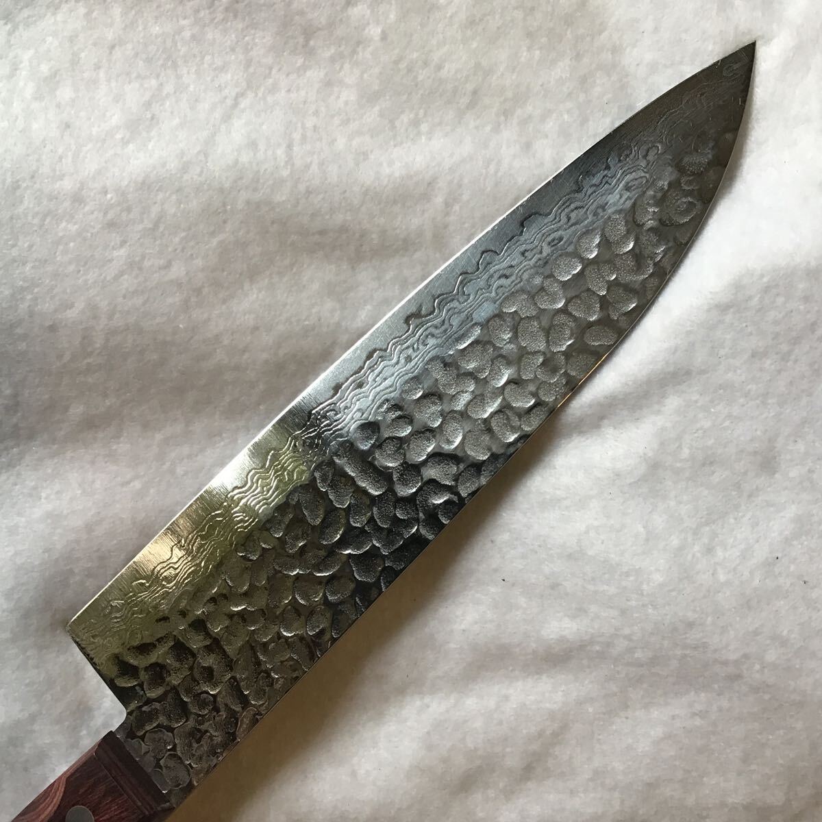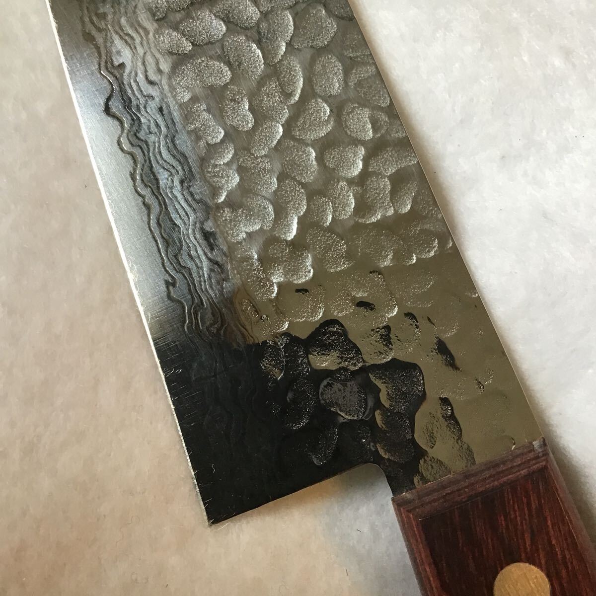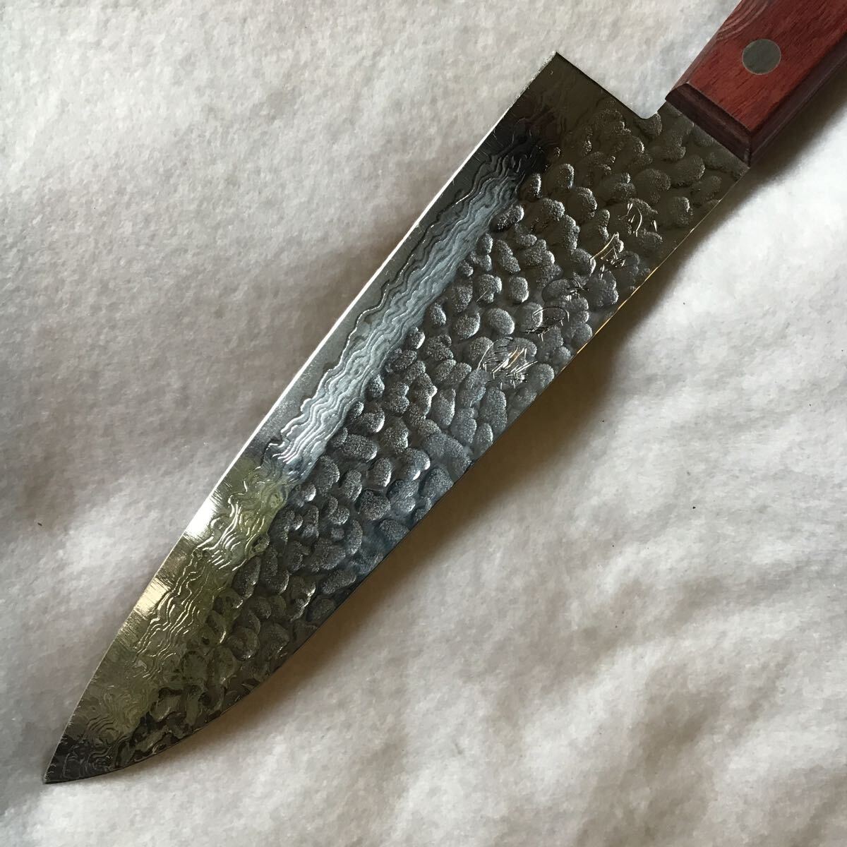 土佐鍛冶師の最高傑作包丁です。土佐刃物の特色を生かし、銀紙3号鋼を、一つひとつ丹念にダマスカス製造した一品です。既製品では出せない切れ味、耐久性となり、お手入れをすれば長期的にご使用可能です。もちろん肉も野菜も刺身もストレスなく調理できます。