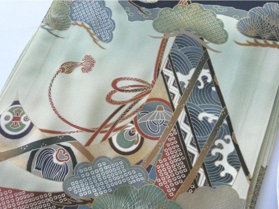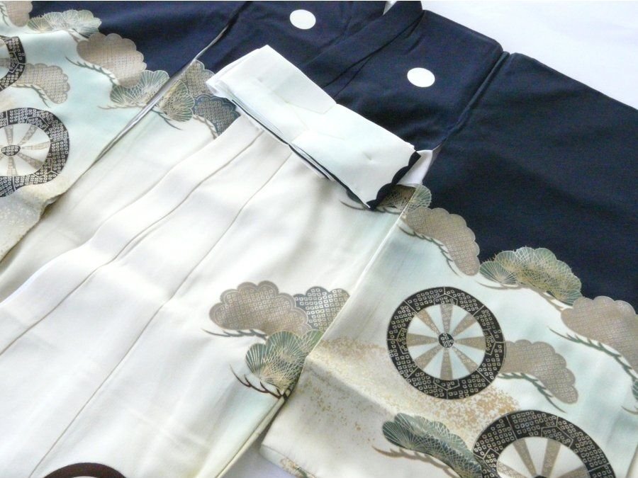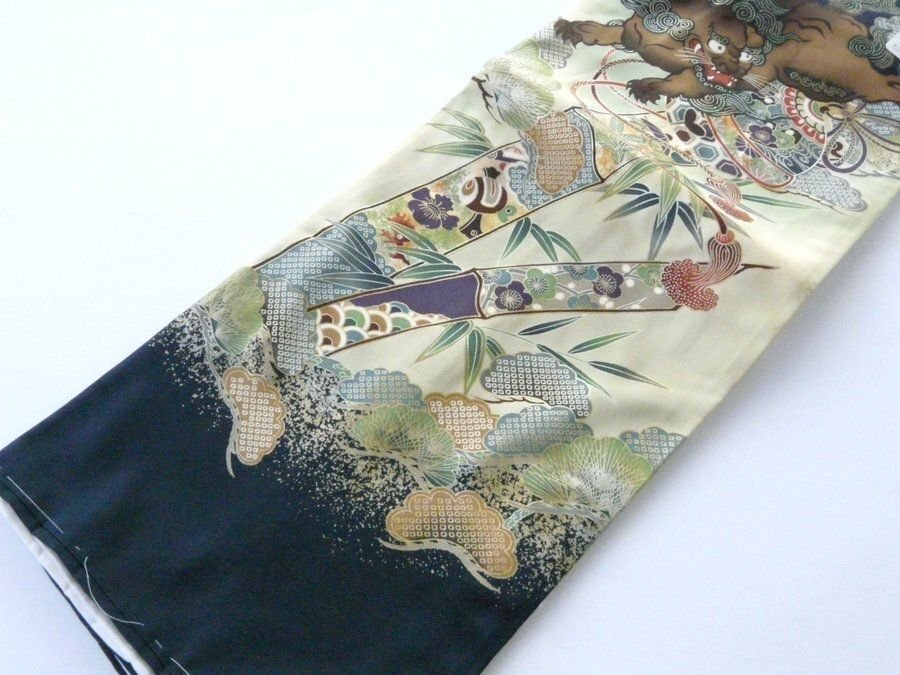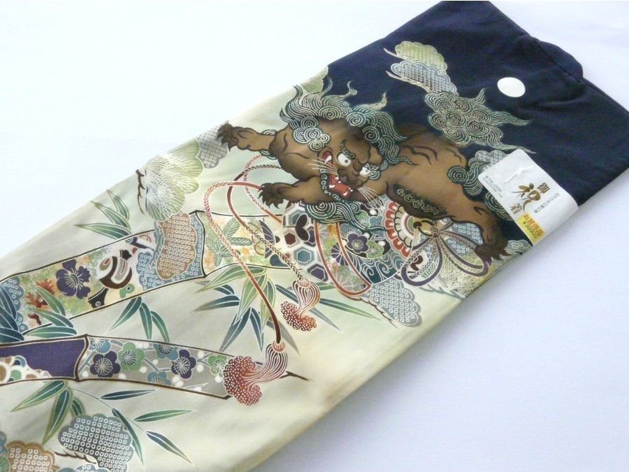 お宮参り 男児のしめ 紺地と茶 狛犬/松/鈴 石持ち 正絹 祝着 のしめ 016