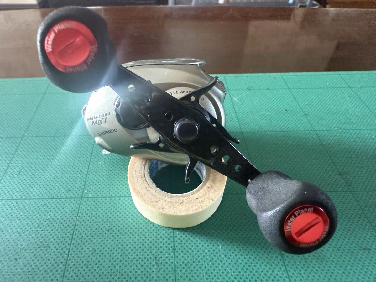 実釣未使用のウォータープラネット製カーボンハンドルに交換しています。(リテイナーなし