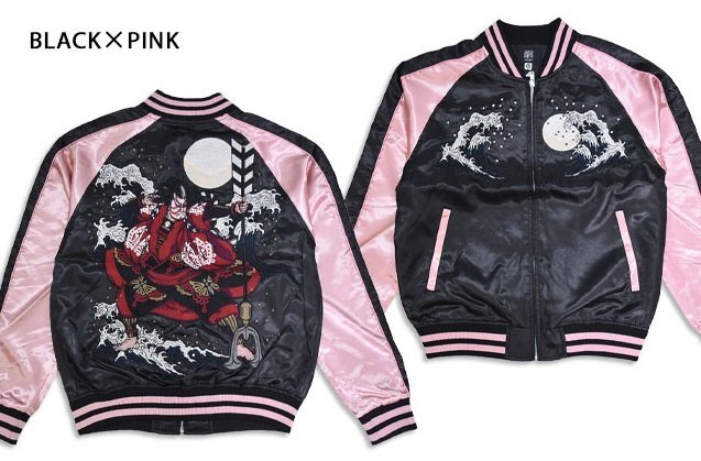 サテンスカジャン「歌舞伎」 ◆朧 ブラック×ピンク XXLサイズ 9053812 和柄 和風 おぼろ カブキ 刺繍 スーベニアジャケット
