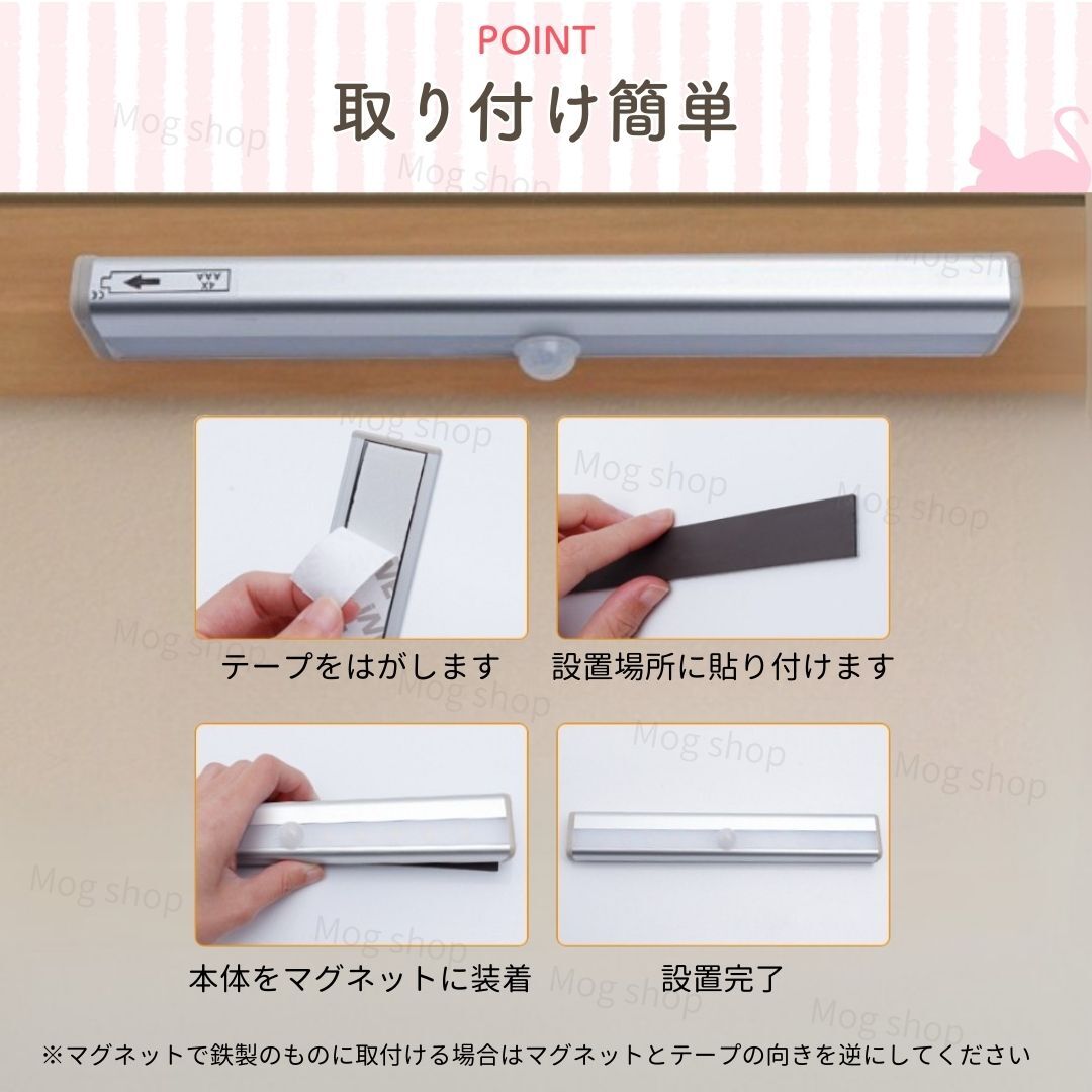 工事配線不要、マグネット(テープ兼用)で簡単にキャビネット、ベッドの下や壁等に貼り付けることができます。