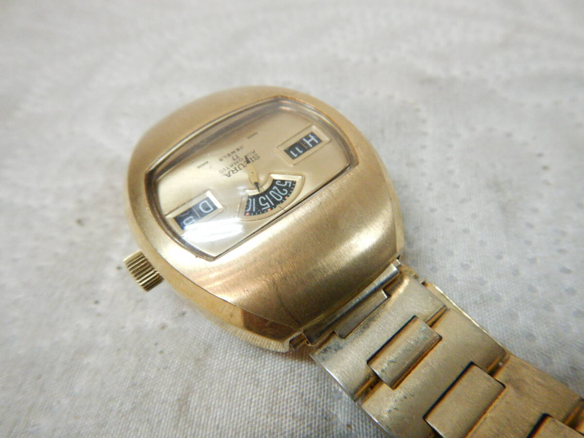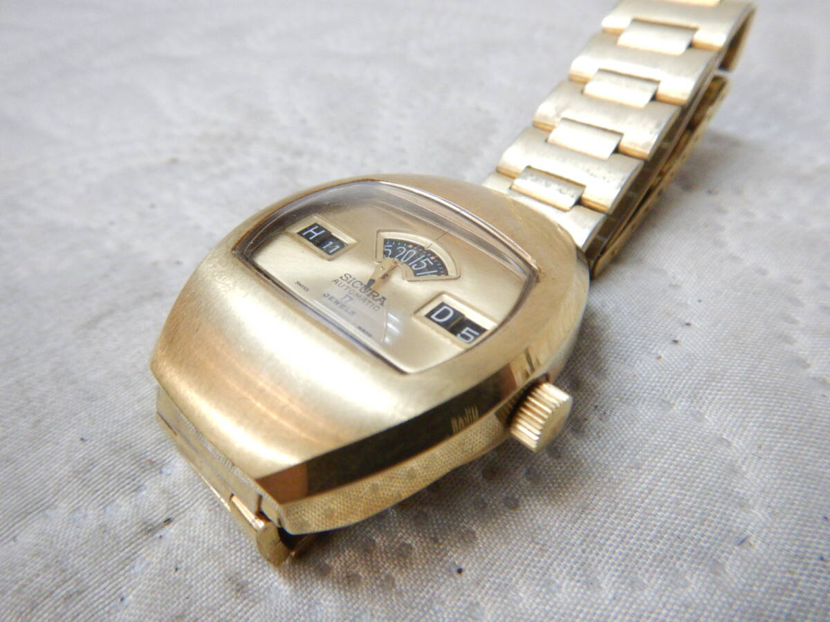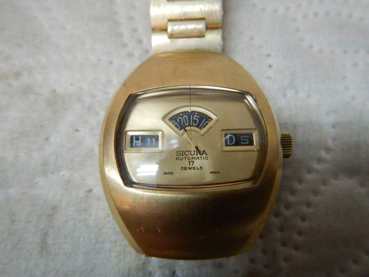 SICURA AUTOMATIC 17石 ゴールド 腕時計 動作良好 綺麗です ケース幅35mm 縦41mm 基本出てきたままの状態で短時間のチェックですが比較的綺麗で大きな狂いも無く良さそうです。 発送はレターパック600円