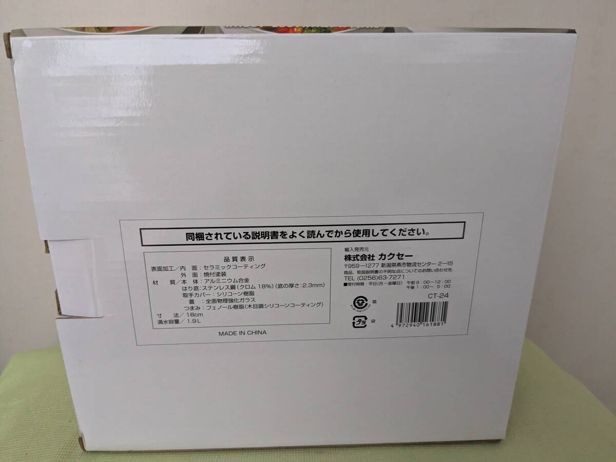 材質:本体:アルミニウム合金、はり底:18-0ステンレス(底の厚さ:2.3mm)、取手カバー:シリコーン樹脂、フタ:全面物理強化ガラス、つまみ:フェノール樹脂(木目調シリコーンコーティング)