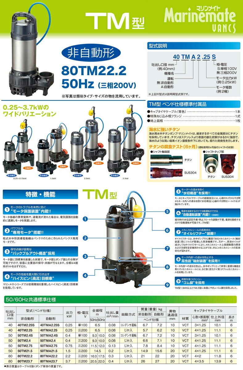 鶴見製作所 海水用水中チタンポンプ 80TM22.2 50Hz〔80径・50Hz用(三相 200V)〕