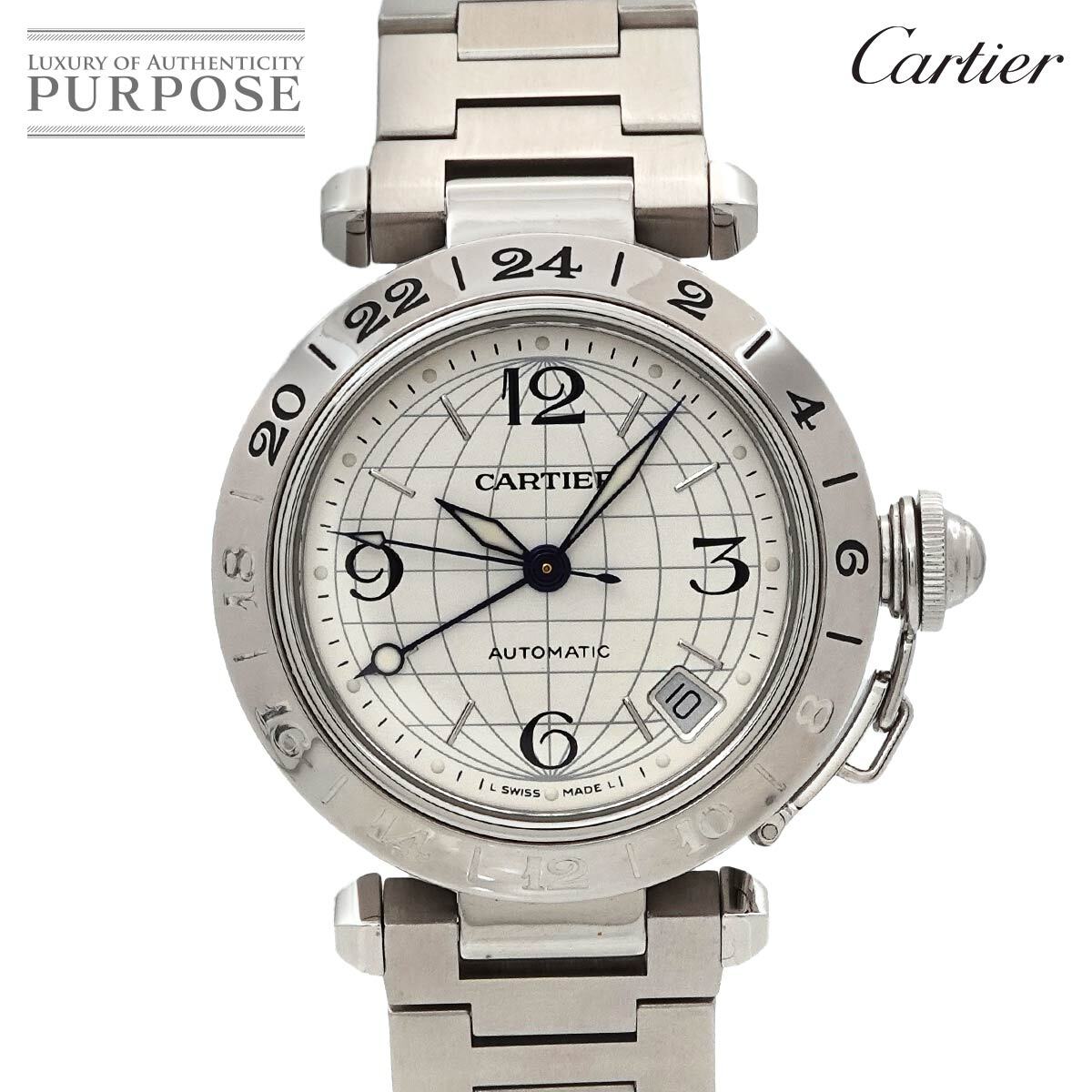 商品概要 | カルティエからGMT機能搭載の人気モデル『パシャC メリディアン』でございます☆従来のパシャCとはデザインが異なり、子午線を想起させる文字盤や、24時間インデックスが描かれたベゼルが採用!ボーイズサイズですので男性はもちろん女性にもおすすめのお品物です♪ |