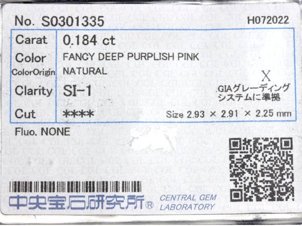 ●クラリティ:SI-1 ●カラー:FANCY DEEP PURPLISH PINK ●0.184ct 【ct数の刻印あり】 ◆脇石 天然ダイヤモンド ●総計0.85ct 【ct数の刻印あり】 ◆付属品【中央宝石研究所】発行 ソーティング】 |