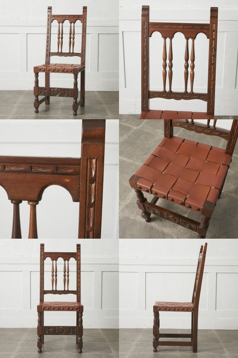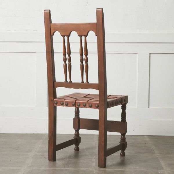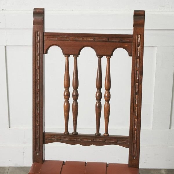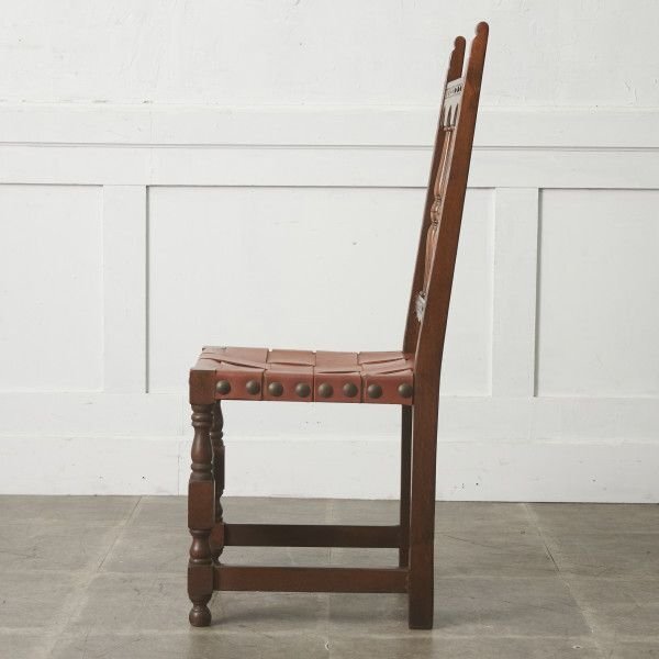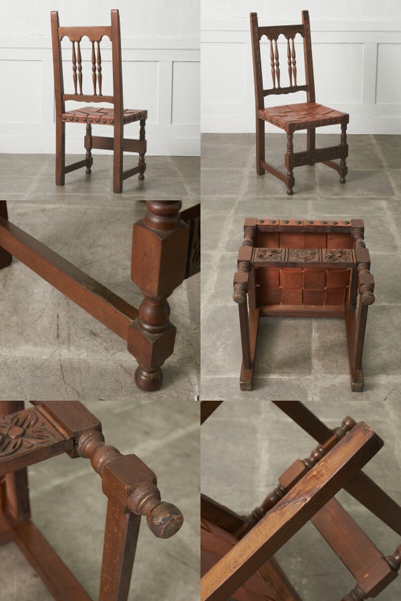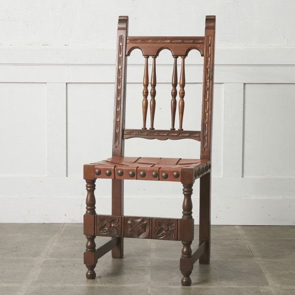 挽物装飾や木彫刻など随所に美しいディテールを備えたクオリティの高いチェア。座面のレザー張りや鋲打ちが重厚感のあるヴィンテージの風合いを醸し出し、使い込まれて程よく古びた風合いが素朴で優しい雰囲気を演出します。