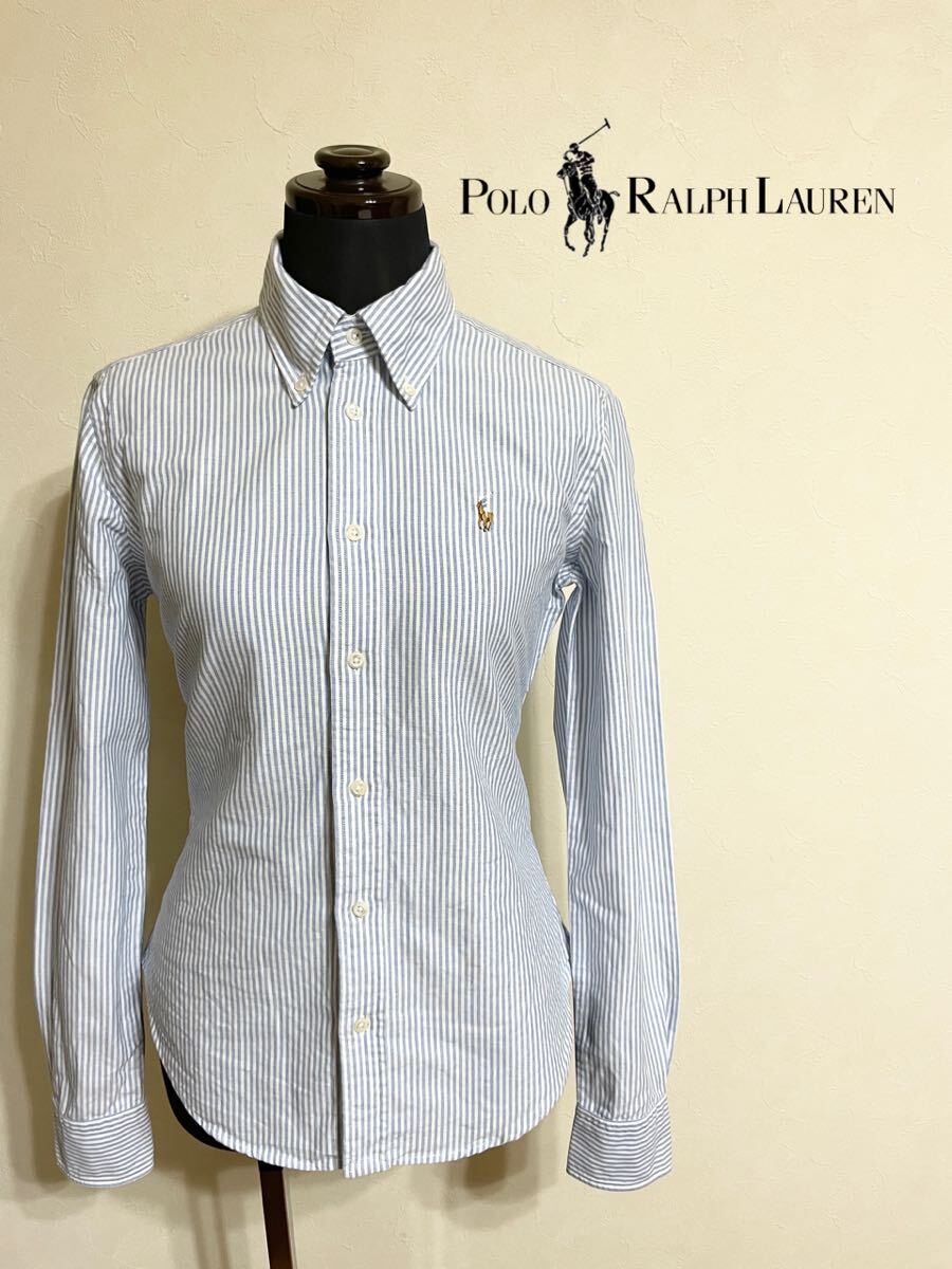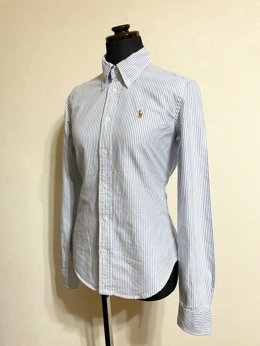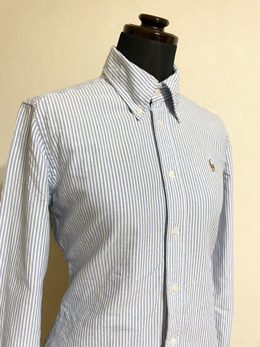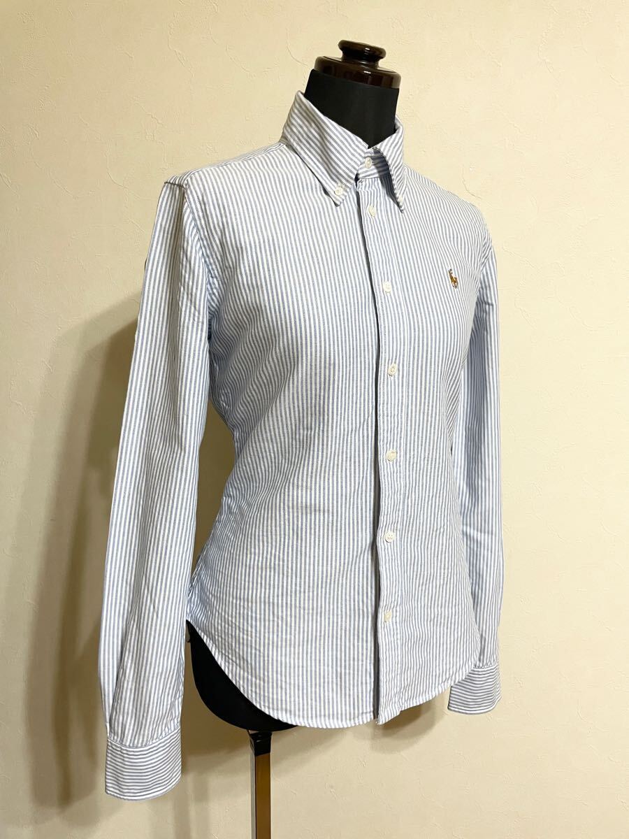 【品名】【美品】 ポロ ラルフローレン レディース ボタンダウン オックスフォードシャツ スーパースリムフィット サイズ2 長袖 ストライプ 白水色