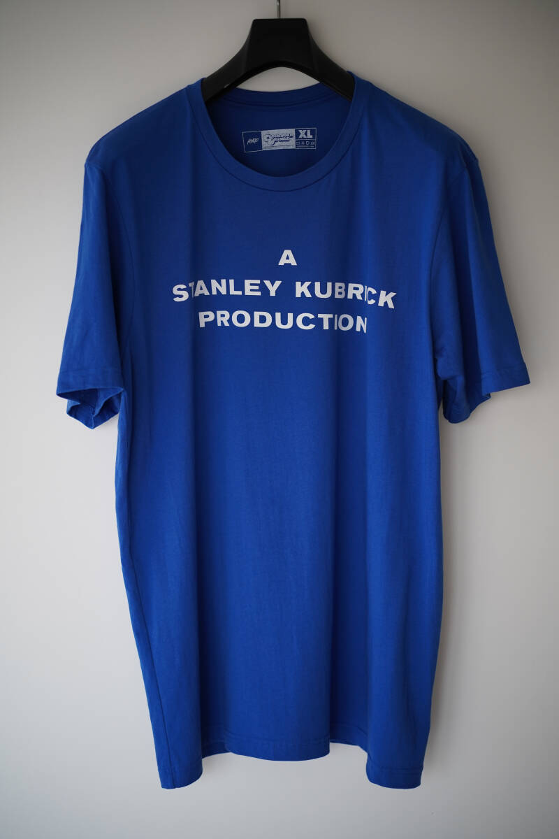 こちらはスタンリーキューブリック監督の代表作 "時計じかけのオレンジ" のオープニングクレジット(青い画面に白文字で「A STANLEY KUBRICK PRODUCTION」)がモチーフになっており、分かる人に分かるデザインがそのままTシャツになっています。