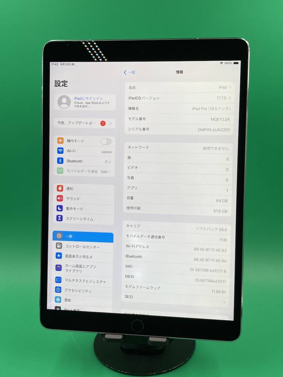 【商品名】iPad Pro 10.5インチ Wi-Fi+Cellular 【容量】64GB 【カラー】スペースグレイ 【型番】MQEY2 J/A 【バッテリー最大容量】85% 【アクティベーションロック】解除済み 【シリアル / IMEI】355817084692118 【SIMロック】解除済み 【キャリア】KDDI 【利用制限】○ 【初期不良】商品到着後1週間 【付属品内容】 ★本体 ※その他注意事項: ♪液晶面:純正パネル、白抜けがありますが、問題なくご使用できます。 ♪本体状態:本体使用感・傷ありますが、使用上には影響ありません。 通信含め、動作確認済みで、全て問題なく、使用できます。 【発送日程】当日または翌日(当日12時過ぎた場合は翌日になります。) 【発送方法】2、ヤマト運輸コンパクト 【定休日】日曜日(土曜日12時以降、日曜日お支払いの場合は月曜日に発送致します。) 【管理番号】AJ120250912−GD0507 【免責事項】 1、写真はなるべく分かりやすいよう、傷、汚れなどを隠さず、正確な情報をお伝えしますが、 一部どうしても映れない傷、汚れがあるかもしれませんので、ご注意ください。 2、あくまで中古品ですので、多少の汚れ、細かい傷がございますので、神経質な方はご慎重にお考えください。 3、また、バッテリーは消耗品のため、保証の対象外となります。 | ||