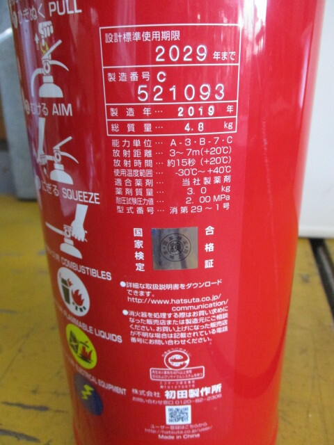 HATSUTA 粉末(ABC)消火器 PEP-10N ③ 業務用消火器(蓄圧式)(株)初田製作所 設計標準使用期限 2029年