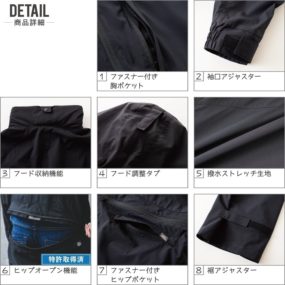 特長:ファスナー付き胸ポケット/ファスナー付きヒップポケット/フード収納機能/袖口・裾アジャスター/撥水ストレッチ生地