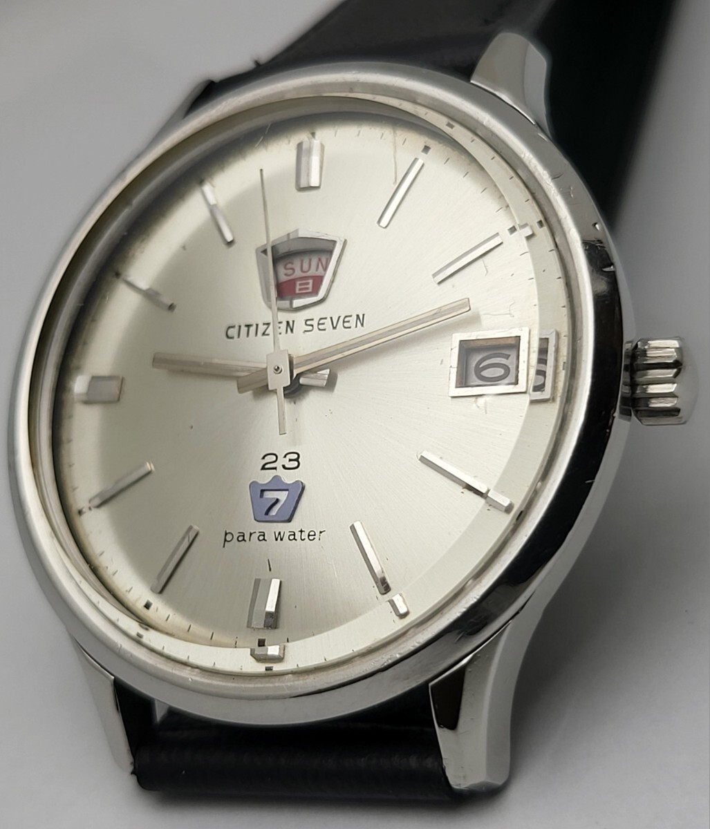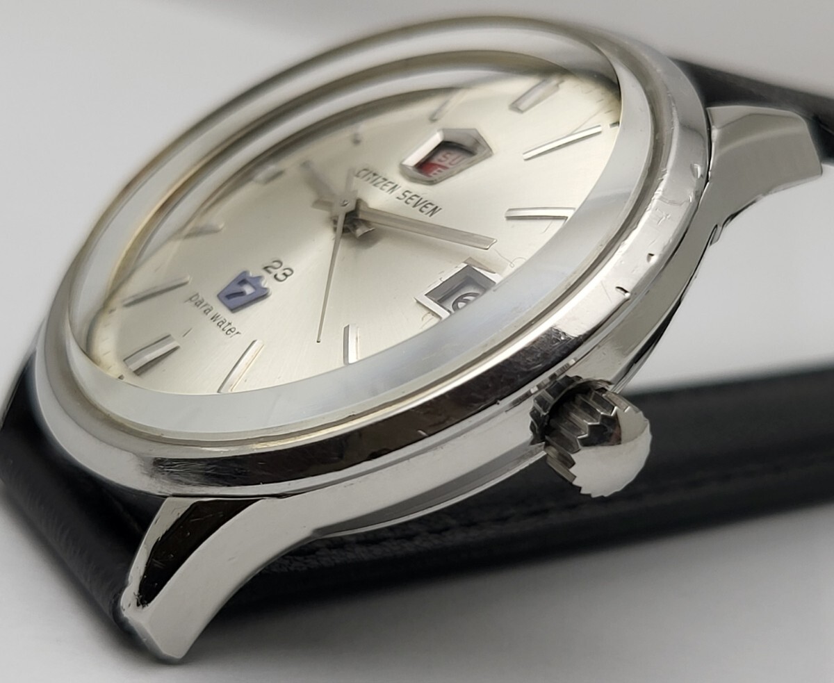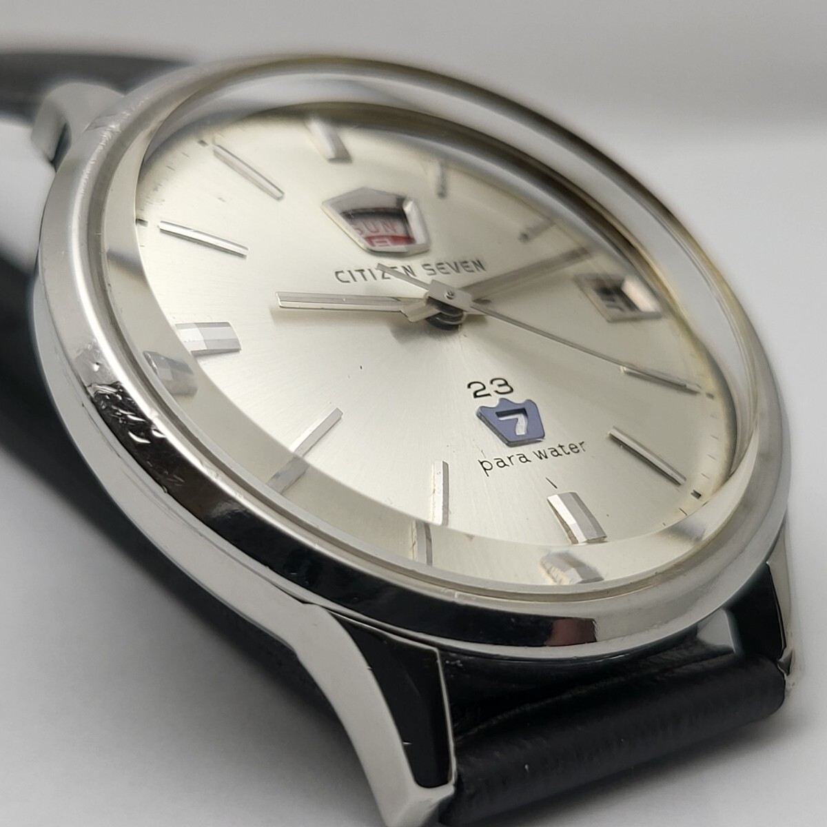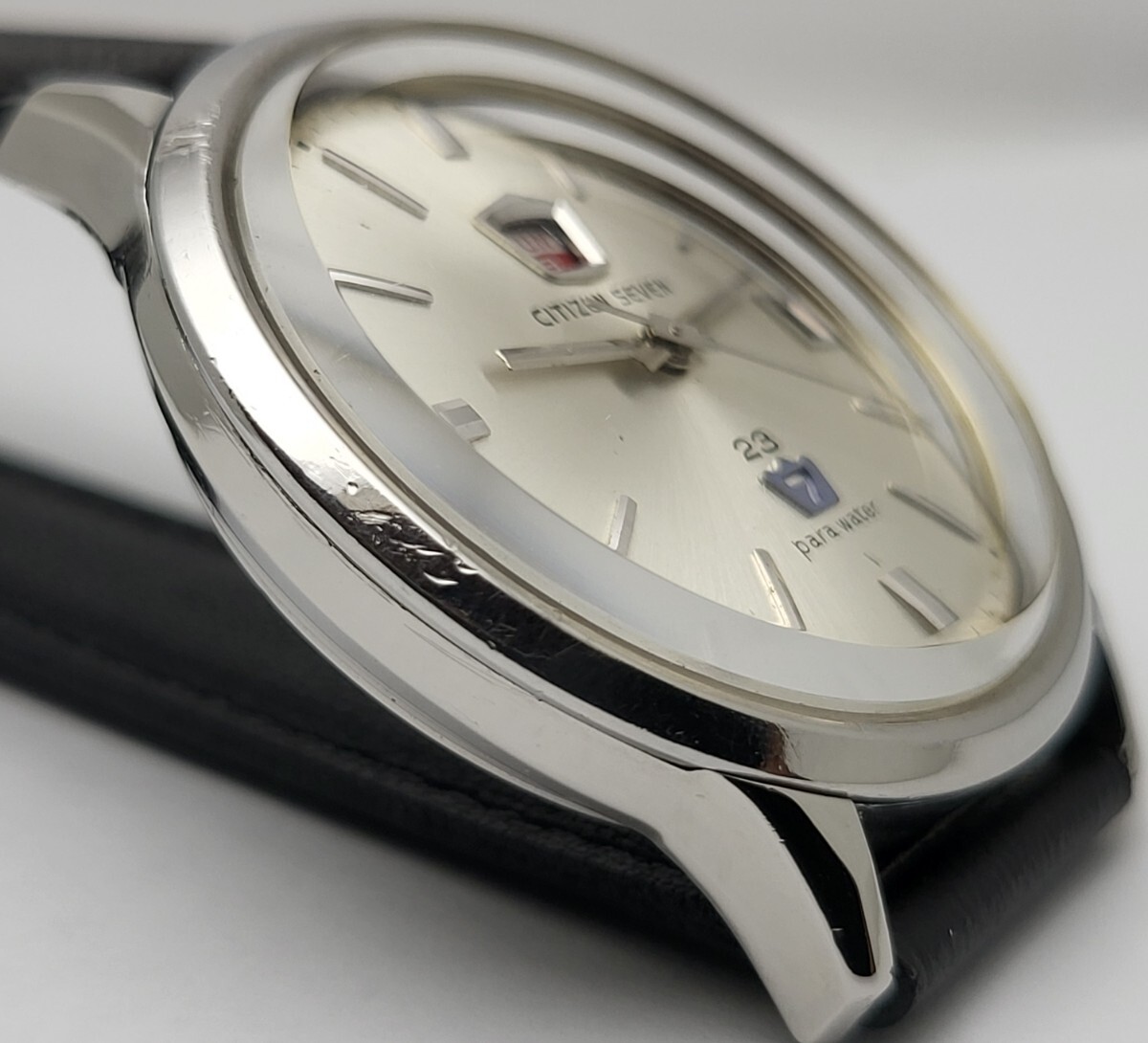 この製品は、昭和30年代最後期に登場した『手巻き製品』です。 あまり見かける事の少ない、クリスタルガラス製の防水ケース、パラウォータです。 厚みもあり、手巻き時計には珍しい重厚感のある製品です。