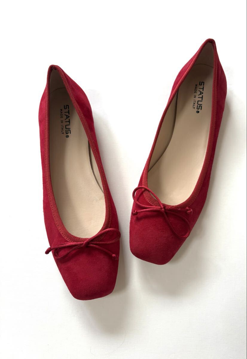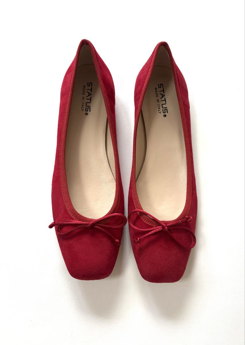 「STATUS ステイタス」のバレエシューズです。サイズ・・・38(約24cm~約24.5cm)。素材・・・レザー。カラー…赤。定価・・・19000円位。イタリア製。しっとりとした質感のスエード素材です。スクエアトゥの綺麗なシルエットで、パンツスカート問わずに合わせやすいと思います。試着のみの未使用品です。そのままクローゼットに置いていたので、多少の擦れなどはあります。1度個人の手に渡ったものですので、神経質な方はご遠慮ください。箱はありません。よろしくお願いいたします。