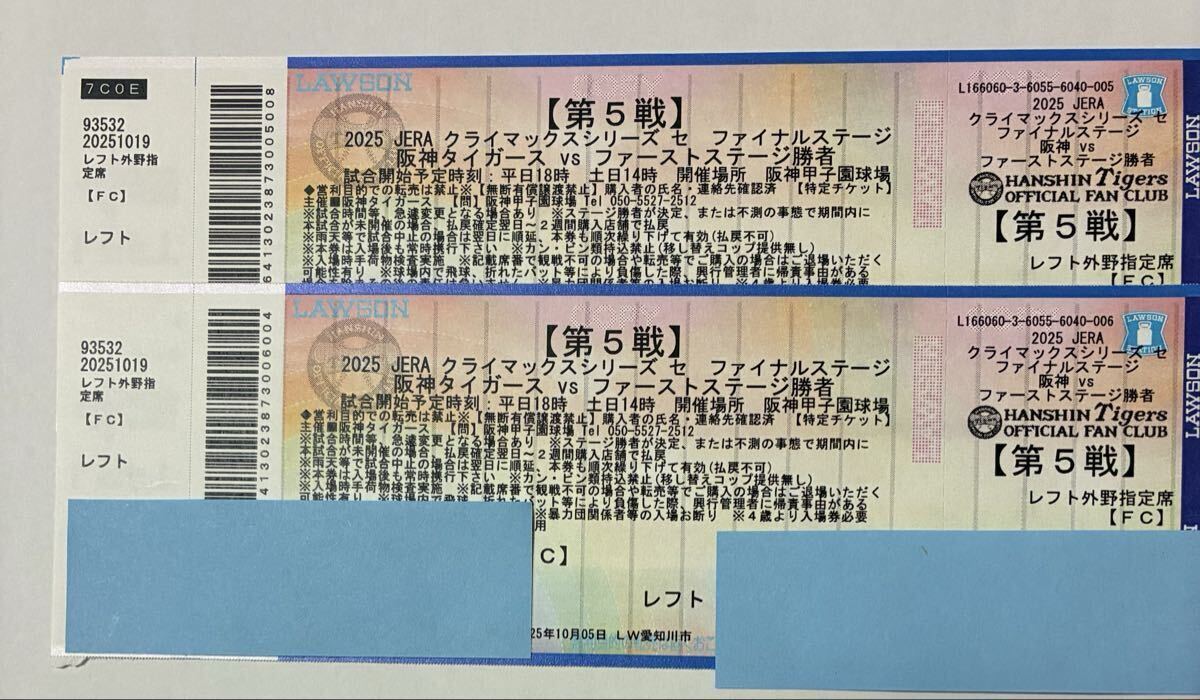 【第5戦】クライマックスシリーズ ファイナルステージ 阪神タイガース対ファーストステージ勝者 甲子園 10月19日 レフト外野指定席 ベア 30段〜40段161〜180番 お席に関する質問はご遠慮ください。通路側ではありません。2枚セットです。